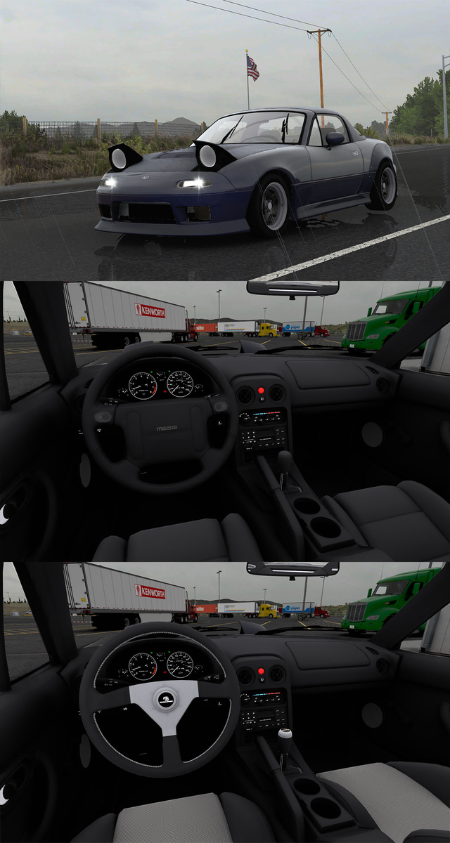 CHANGELOG:- - Updated to game version 1.47 - Minor edits and fixes Specifications:- - High-quality exterior & interior - Realistic interior lighting - Openable Front Windows - Wipers work accurately - Indicator and wiper stalk, handbrake and hazard warning button animations - Realistic engine configuration (1.6L 90HP and 113HP, 1.6L Tuned and 1.8) - Realistic transmission configuration (5-speed Manual) - 4 different hoods, (with vents, popup headlights or without either of them) - 3 front and rear bumpers (Stock, with Splitter and Tuned) - 3 rims, (Stock, Tuned and Tuned Glossy) - 2 different steering wheels (Stock and Mazdaspeed) - 2 different seats and gear knobs (Stock and Mazdaspeed) - 2 different roofs (Soft Top and Hard Top) - 2 spoilers (Stock and Tuned) - 2 side skirts (Stock and Tuned) - 1 optional rear fender arch extension FAQ: Q: Where to purchase it?: A: Truck Dealers > Access Mod Dealer > Mazda Q: Car is not going above xyz speed A: This is a Manual car, so shift gears *manually* to increase the speed Credits: Nimit, Mert İrşi, Slav Jerry Credits: Nimit, Mert İrşi, Slav Jerry |