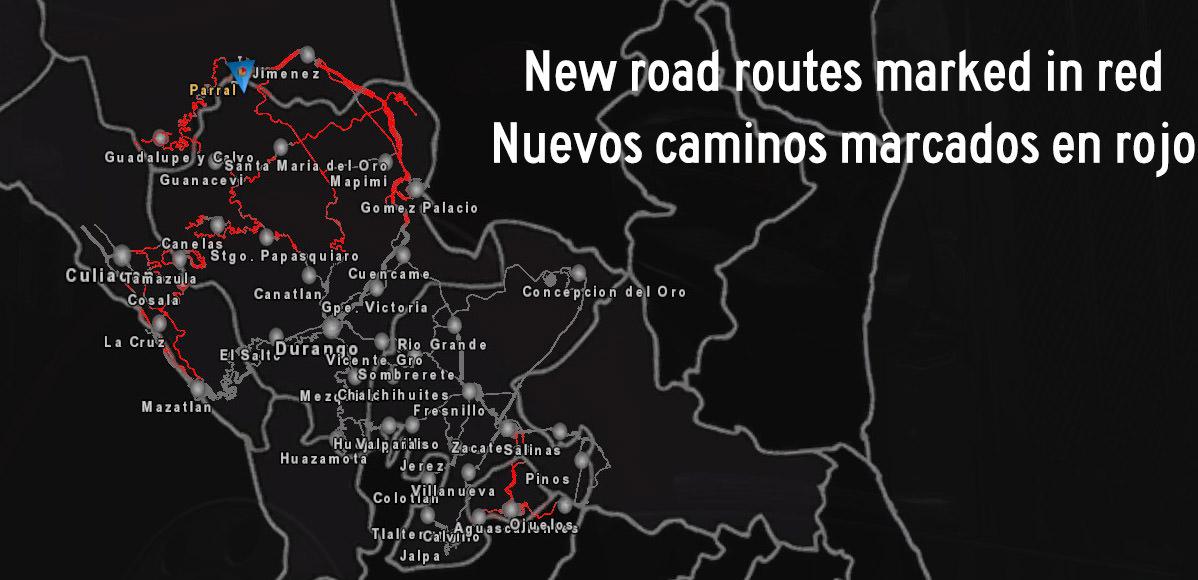 -Special transport support (6 routes) -Aguascalientes state added. -Remodel of durango state enterely. -New areas south of chihuahua state (rest of the state is WIP) -New deliveir areas from oregon DLC assets (Oregon DLC needed) -Remodel of extreme route in Canelas and Tamazula -New remodel routes in Durango state, federal road 23, 45, 49 and state road 44. -A maze! first in ATS, figurate out in Mapimi area called "Zona del Silencio" -New urban and rural junctions in map -17 new cities and remodels in 2.1 "Aguascalientes". New cities in 2.1 "Aguascalientes"; -Aguascalientes, Ags -Calvillo, Ags -Parral, Chih -Jimenez, Chih -Gpe y Calvo, Chih -Nuevo Ideal, Dgo -Rodeo, Dgo -Mapimí, Dgo -Sta Ma del Oro, Dgo -Tepehuanes, Dgo -Ojuelos, Jal -La Cruz, Sin -Cosalá, Sin New remodeled cities in 2.1 "Aguascalientes"; -Gómez Palacio, Dgo -Santiago Papasquiaro, Dgo -Canelas, Dgo -Tamazula, Dgo -Guanacevi, Dgo Updated the mod of Mexico Extremo to 2.1.8, which includes several fixes for an invisible wall, visual bugs, added some more rest areas in different parts of the map as suggested. NEW MEXICO DLC NEEDED OREGON DLC NEEDED Viva Mexico 2.5.1 map updated Mega resources 2.0.9 updated LOAD ORDER: **Other mods such vehicles, trailers, skins, etc **OTHER MAP MODS such CanaDream or Coast2Coast Mega Resources 2.0.9 Mexssimap 1.2 (if used) Mexico Extremo 2.1.8 Viva Mexico 2.5.1 México Extremo v2.1.8: https://sharemods.com/p9y7869k0x8k/MexicoExtremo_v2_1_8_eblem.scs.html Mega Resources v2.0.9: https://sharemods.com/4f6y42qpgjlv/Mega_Resources_v2_0_9.scs.html Viva Mexico v2.5.1: https://sharemods.com/idphr6a5fglc/VivaMexico_v2_5_1_hugoces.scs.html Mexssimap v1.2: https://sharemods.com/zuf9p2qhcc0b/Mexssimap_SLP-v12.scs.html Credits: Jbte |