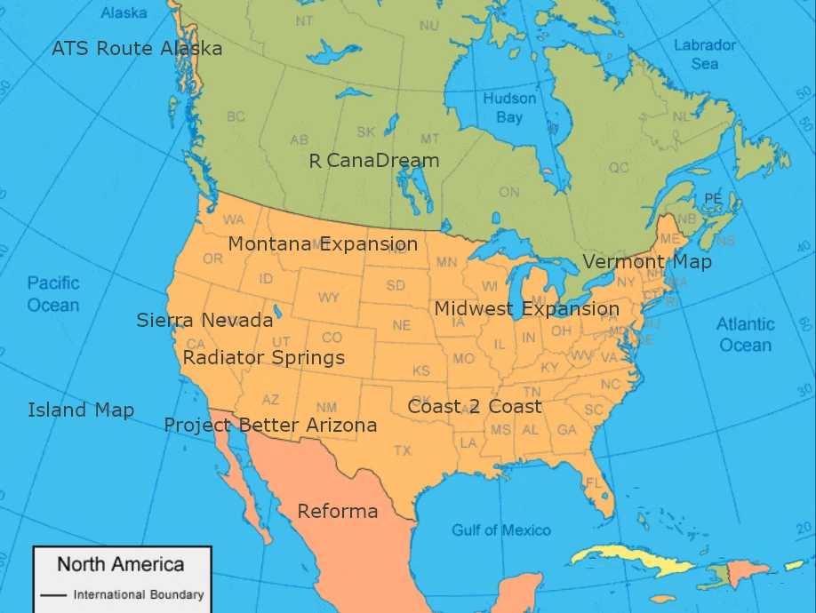 North America v.001 with/rCanaDream is a map multimod. It is made from C2C, rCanaDream, Route Alaska map, Island Map, Montana Expansion, Midwest Expansion, Project Mid Atlantic, Project Better Arizona, US 24 extention, Vermont Map, Sierra Nevada Legacy, Reforma [Mexico Part] and just for fun Radiator Springs. It will work with caribean Map if you load both models files and the C2C Connector above this mod and the def_map file below. It does not work with ProMods Canada for obvious reasons. # Display name can be any string with any length. display_name: “CanaDream and Triangle v2.16.1” # Author can be any string with any length. author: “Robby Van Calster” # Display name can be any string with any length. display_name: “map route alaska v 1.3” # Author can be any string with any length. author: “ivm” # Display name can be any string with any length. display_name: “Coast to Coast v2.12.43.4” # Author can be any string with any length. author: “Mantrid” display_name: “Island Map 0.2.1” author: “Duckie” # Display name can be any string with any length. display_name: “Midwest Expansion (Beta)” # Author can be any string with any length. author: “Jacemeister” # Display name can be any string with any length. display_name: “Montana Expansion v1.0.3.9” # Author can be any string with any length. author: “xRECONLOBSTERx” display_name: “PMA-C2C 0.3 PUBLIC” author: “GrayBones” # Display name can be any string with any length. display_name: “Project Better Arizona 0.1.3.1 for Reforma Map” # Author can be any string with any length. author: “AzNate” # Display name can be any string with any length. display_name: “Radiator Springs Map add-on” # Author can be any string with any length. author: “ETS2-User” display_name: “Reforma 2.2.5” author: “Reforma Team” “US 24 Extension V1.4” author: “Digital X” “Vermont Map” author: “SteelAndCities” Credits: K-DOG |