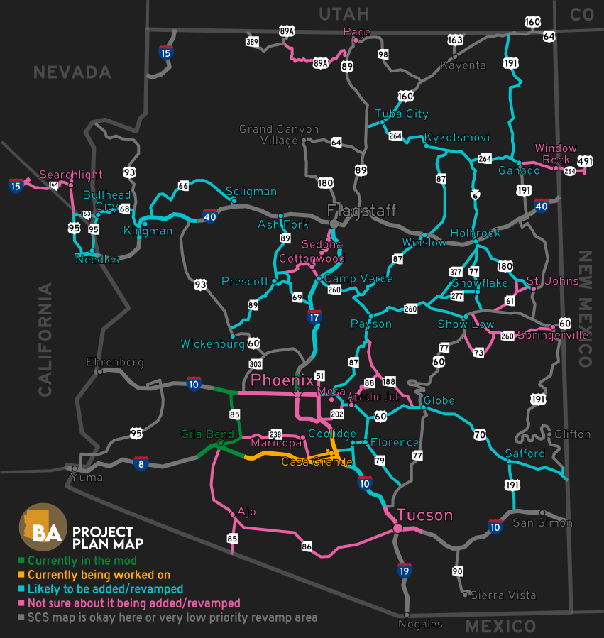 Better Arizona - is a project that aims to improve and add to Arizona in American Truck Simulator. I plan to work on improving existing parts of Arizona such as Phoenix, Tucson, and Kingman and add some new cities to the state as well. Cities that I plan to add are Gila Bend, Payson, Prescott, Casa Grande, and more! Changes in v0.1.3.4: - Fixed broken connections on US 95 between Yuma and Quartzsite Credits: AzNate |