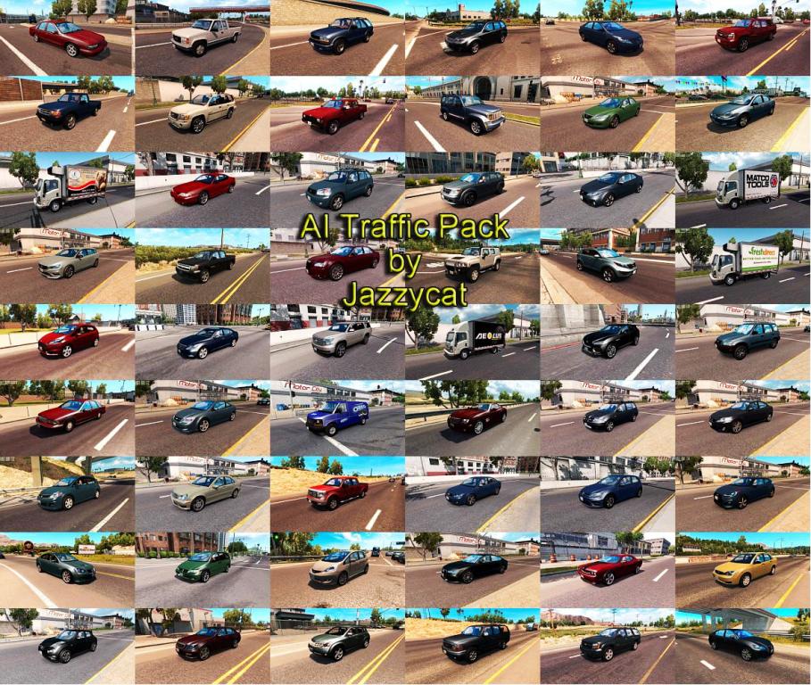 Version 7.4 - added Ford F-150 '93, Toyota Land Cruiser 100, BMW X1. Pack adds in traffic 216 new AI cars: Chevrolet Blazer, Tahoe('07, '15), Caprice, Cruze, Malibu, Silverado('07, '18), Colorado('07, '15), Avalanche, Trailblazer, Cobalt, Impala('96,'06), Suburban '98, Spark, Camaro, Corvette Dodge Grand Caravan, Neon, Dart, Intrepid, Caravan, Journey, Caliber, Durango('99,'11), Ram(1500, 2500, 3500), Charger('06, '12), Challenger Ford F150('93, '10, '18), F350, Focus, Taurus, Fusion, Mustang('95, '13), Ranger, Explorer('96, '10), Expedition, Escape('08, '13), Flex, Fiesta, E150, F250(service) Chrysler PT Cruiser, 300C('08, '12), LHS, Pacifica Jeep Wrangler, Liberty, Grand Cherokee GMC Yukon('00, '07), Savana, Canyon, Envoy, Vandura, Sierra, Jimmy Cadillac CTS('04, '10), XTS Pontiac G8, Sunfire Plymouth Grand Voyager Oldsmobile Cutlass Ciera, Alero Buick Roadmaster Mercury Tracer Saturn Ion Lincoln Town Car, MKX Hummer H3 Toyota Tundra, Camry('97, '07, '18), Corolla('95, '08), Land Cruiser(100, 200), Highlander, Rav4, Yaris, C-HR Lexus GS, IS(XE10, XE20, XE30), LS, CT, LX Scion xD, tC('05, '12), xB Honda Fit, Civic('07, '12, '19), CR-V('01, '07, '15), Odyssey, Insight, Pilot Nissan Altima, Sentra, Frontier, Murano, Maxima '97, Leaf, Versa, Juke, Titan, Hardbody Hyundai Sonata, Tucson, Santa Fe, Veloster, Elantra Infinity Q50, G35, G37, XF50 Kia Sportage, Soul, Forte Koup, Stinger Mitsubishi Montero, Outlander, Lancer, Galant Subaru Legacy('05,'10), Forester Mazda 3('12), 6('06, '08, '15), CX-3 Suzuki Liana Triple E Commander Mercedes-Benz C-Class(W203, W204), E-Class(W212, W213), S-Class(W221, C217), R-Class, GL, ML, GLA, GLC(coupe), GLE(coupe), Metris Audi A3(sedan), A4(B6, B7, B8, B9), A5, A7, A8(D4), Q7('08, '15), Q5 BMW 3(E46, E92, F80), 5(F10, G30), 7(E65), X1(E84), X3(F25), X5(F15) Volkswagen Jetta(4, 5), Golf 7, Beetle, Touareg, Tiguan, Arteon Volvo S60, V60, XC90'17, 850(wagon) Porsche Cayenne, Macan, Panamera, Panamera Sport Turismo Land Rover Evoque, LR3 Saab 9-3('02, '08), 9-7x Jaguar F-Pace, XE Maserati Ghibli, Levante Mini Clubman Fiat 500 Smart Fortwo All standalone, works on any maps. Included real 3D logos for default cars. Compatible with all my packs. Tested on version 1.35.x and 1.36.x beta Credits: JAZZYCAT |
