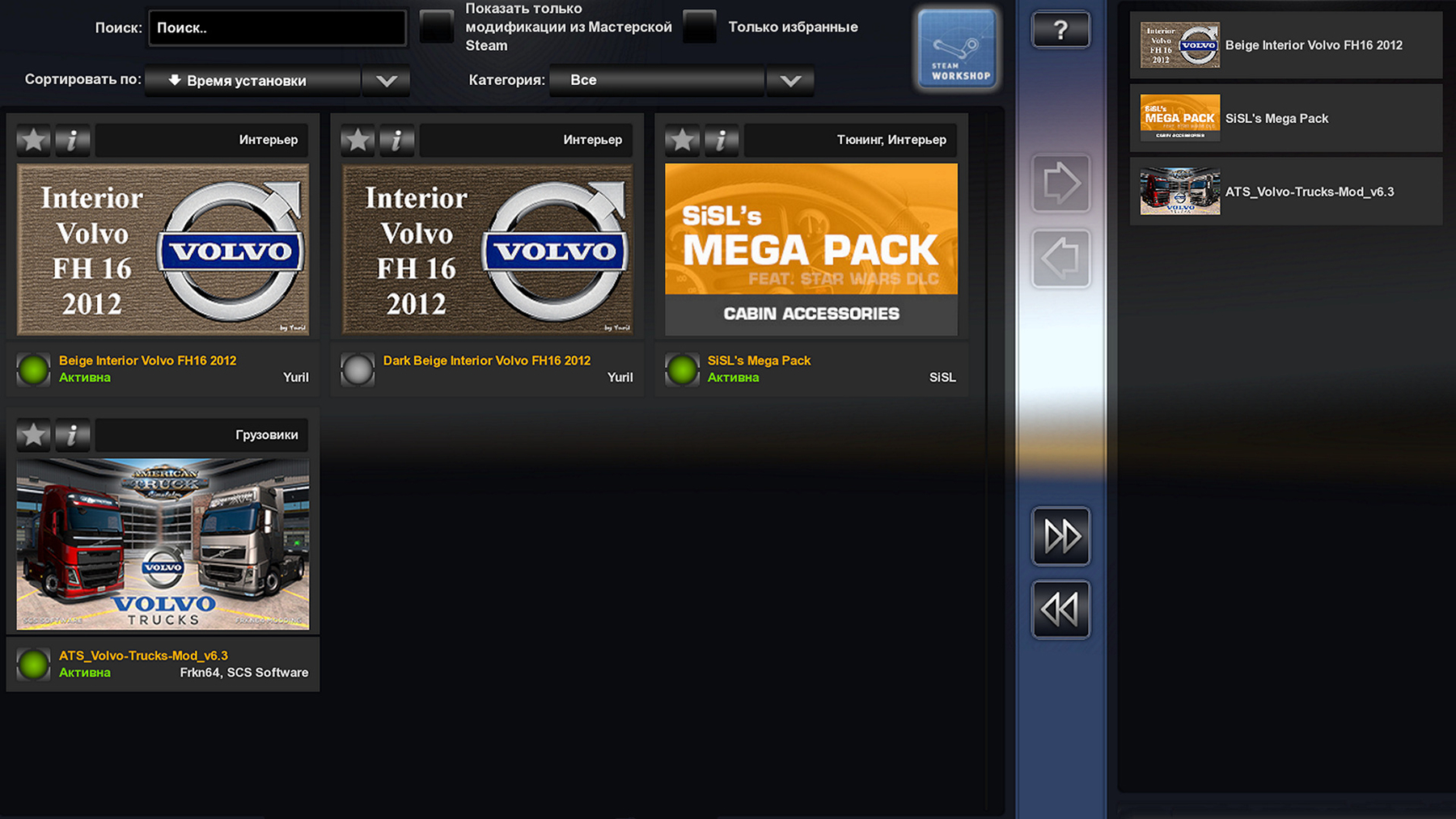 Two options - Beige and Dark beige. Requires Volvo FH16 (2012 и 2009) Trucks v.6.3 LHD interiors only. To install the toys, you need Sisl's Mega Pack. Put one of your choice. For ATS only. Volvo engine sound in video - from Krichbaum mod. Credits: YuriI |
