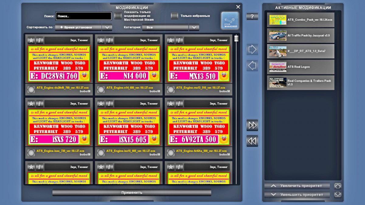 _ _ – = American Truck Simulator ver.1.30.x = – _ _ ATTENTION! You have the right not to use these mods and the delete them your out PC. You can freely distribute these mods on your behalf. – – – – – – – – – _ USER MANUAL: _ These mods do not change the game process, you can use them at any time, it’s enough to leave the game and connect or replace one mod then continue the game. _ For correct operation, use any one, but only one mod – – – – – – – – – The name list 12 of mods, differing by a engine and sound for trucks (SCS) ATS: * – Kenworth W900 and T680 * – Peterbilt 389 and 579 – This the mods for change the engines, transmissions, sounds and the light the headlight in trucks (SCS) ATS = = = = = = = = _ List mods: 01 – ATS_Engine-6v92ta_500_ver.18.I.27.scs 02 – ATS_Engine-cat15_595_ver.18.I.27.scs 03 – ATS_Engine-cat3406_550_ver.18.I.27.scs 04 – ATS_Engine-dc28v8i_760_ver.18.I.27.scs 05 – ATS_Engine-dd16_600_ver.18.I.27.scs 06 – ATS_Engine-dd60_585_ver.18.I.27.scs 07 – ATS_Engine-dds92_500_ver.18.I.27.scs 08 – ATS_Engine-isx15_605_ver.18.I.27.scs 09 – ATS_Engine-isxs_720_ver.18.I.27.scs 10 – ATS_Engine-mx13_510_ver.18.I.27.scs 11 – ATS_Engine-n14_600_ver.18.I.27.scs 12 – ATS_Engine-n14c_610_ver.18.I.27.scs _ _ end the mods _ _ All in archiv – ATS_engine_for_all_truck_ver.18.I.27.rar (~24mb) When creating this mods, were used parts of mods – Kriechbaum and other mods, authors I do not know. Credits: bobo58 Credits: bobo58 |