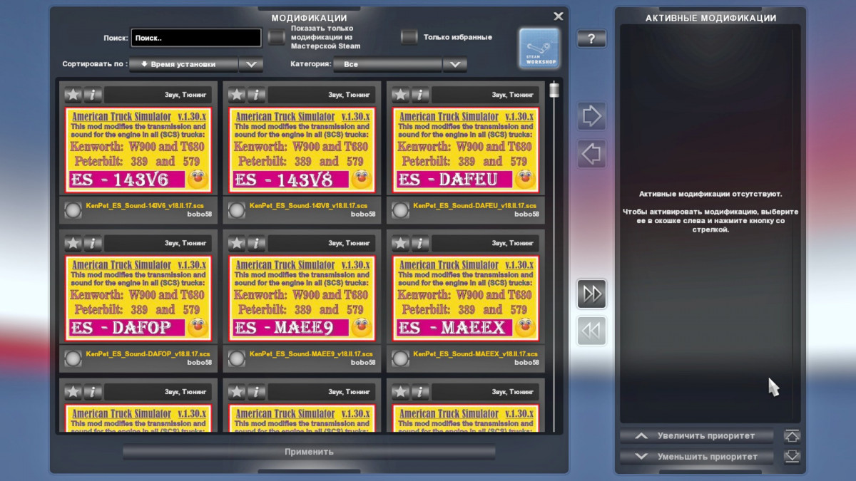 ATTENTION! You have the right not to use these mods and the delete them your out PC. You can freely distribute these mods on your behalf. – – – – – – – – – American Truck Simulator ver.1.30.x Mods ES-versions changes transmits and engine with sound in trucks ATS. (all mods ES-version in folder – [ES-sound_KenPet_mod_for_ATS]) Mods S-versions changes only sounds of any engines in trucks ATS. (all mods S-version in folder – [S-sound_KenPet_mod_for_ATS]) – – – – – – – – – The name list of mods, differing by a sound of the engine for all (SCS) trucks ATS: * – Kenworth W900 and T680 * – Peterbilt 389 and 579 = = = = = = 01 mod pair: – KenPet_ES_Sound-143V6_v18.II.24.scs – KenPet_S_Sound-143V6_v18.II.24.scs 02 mod pair: – KenPet_ES_Sound-143V8_v18.II.24.scs – KenPet_S_Sound-143V8_v18.II.24.scs 03 mod pair: – KenPet_ES_Sound-DAFEU_v18.II.24.scs – KenPet_S_Sound-DAFEU_v18.II.24.scs 04 mod pair: – KenPet_ES_Sound-DAFOP_v18.II.24.scs – KenPet_S_Sound-DAFOP_v18.II.24.scs 05 mod pair: – KenPet_ES_Sound-MAEE9_v18.II.24.scs – KenPet_S_Sound-MAEE9_v18.II.24.scs 06 mod pair: – KenPet_ES_Sound-MAEEX_v18.II.24.scs – KenPet_S_Sound-MAEEX_v18.II.24.scs 07 mod pair: – KenPet_ES_Sound-MAXV8_v18.II.24.scs – KenPet_S_Sound-MAXV8_v18.II.24.scs 08 mod pair: – KenPet_ES_Sound-SAOGT_v18.II.24.scs – KenPet_S_Sound-SAOGT_v18.II.24.scs 09 mod pair: – KenPet_ES_Sound-SGOPN_v18.II.24.scs – KenPet_S_Sound-SGOPN_v18.II.24.scs 10 mod pair: – KenPet_ES_Sound-SOPEN_v18.II.24.scs – KenPet_S_Sound-SOPEN_v18.II.24.scs 11 mod pair: – KenPet_ES_Sound-SV9CR_v18.II.24.scs – KenPet_S_Sound-SV9CR_v18.II.24.scs 12 mod pair: – KenPet_ES_Sound-V8OP2_v18.II.24.scs – KenPet_S_Sound-V8OP2_v18.II.24.scs = = = = = = USER MANUAL: – These mods do not change the game process, you can use them at any time, it’s enough to leave the game and connect or replace one mod of ES-version or of S-version then continue the game. – For correct operation, use any one, but only one mod. When creating this mods, were used parts of mods – Kriechbaum, adi2003de and other mods, authors I do not know. mods and bonus – all in archive: 12_mod_KenPet_ver.18.II.24.rar (~67mb) Credits: bobo58 Credits: bobo58 |