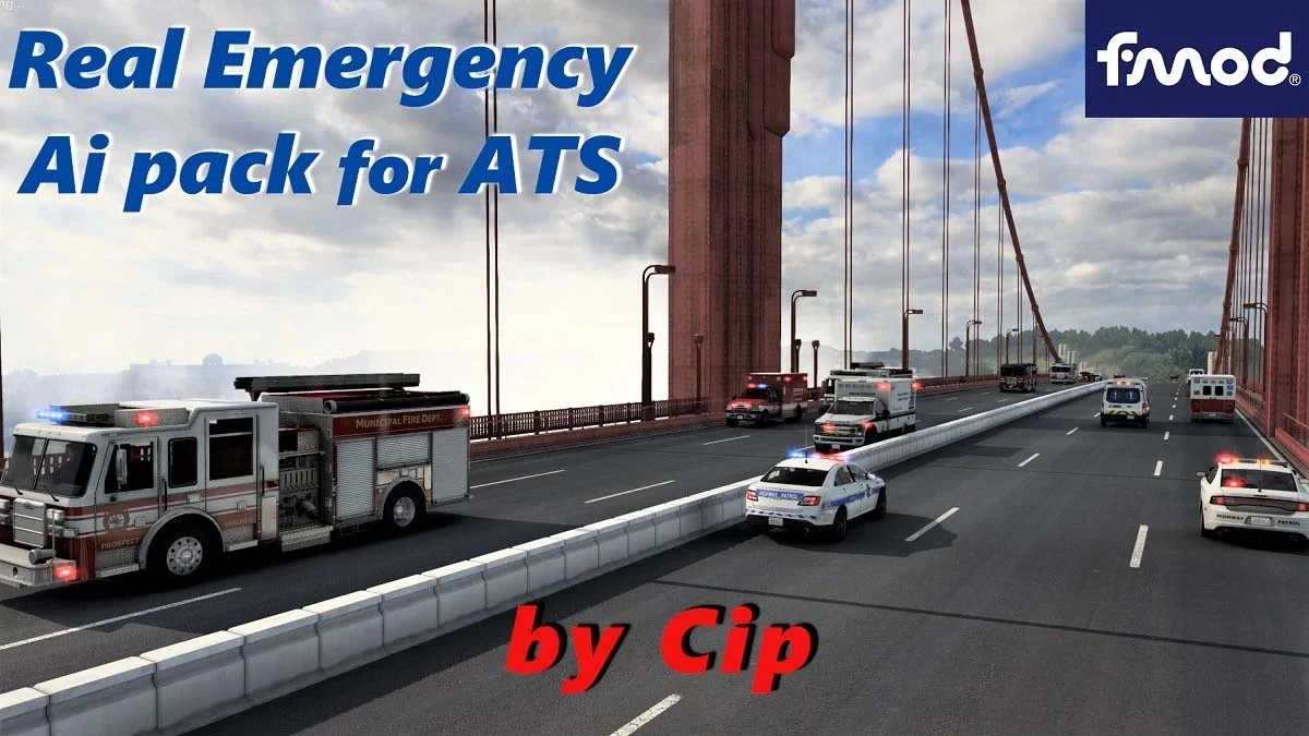 Features: – Mod adding in traffic versions of all SCS stock police and emergency vehicles with beacon and personalized siren sounds, spawning alongside default vehicles and at the same spawn ratio as their opponents – All vehicles have personalized sounds for all ATS states covered by SCS and generic vehicles (which can spawn at low ratio everywhere) are equipped with the most iconic US siren sounds – each vehicle can spawn only with beacon or with beacon and sound, while the sound is also not continuous – each siren sound has a length between 20-30 seconds and the gap until the sound will start again is random – all vehicles have also engine sound (imported from my Real Ai sounds) – no sounds for vehicles spawned in road events other mod features only available if used together with my Real Traffic Density mod: – Emergency vehicles have own speed class, however every Ai will obey traffic signs and red lights – default police and emergency (without beacon and sounds) are restricted only to local roads – a silent version of Real Emergency vehicles (with less probability of having a sound) can also spawn on local roads – Ai vehicles spawning in cities and motorways will be more likely to have a sound Changelog v1.5 Fixed bugs Fix AI behavior Increase AI speed limit Recommended mods in combination with Real Emergency Ai pack: – Real Traffic Density for ATS (offering the above mentioned support + comments and suggestions for Real Ai Emergency pack) – Real Ai Traffic FMOD Sound ATS (for harmonization of all Ai vehicles sounds) Credits Cip Credits: Cip |