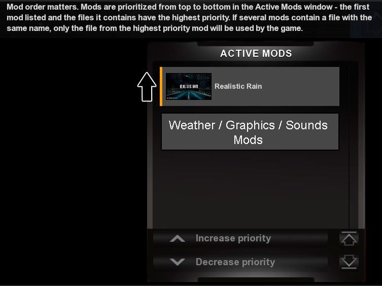 Changelog v3.9.1 Some adjustments to the behavior of the raindrops for the interior of the cabin have been modified for greater realism and fluidity: - Transformation time, shape of the raindrops, speed of the raindrops when moving the windshield... - Visibility of raindrops ("outside" rain) was very slightly increased - Made some minor adjustment to the sound of rain from the cabin This mod will not add puddles on the road. This mod does not modify the duration or probability of rain (game options you have for it) This mod does not modify the fog, weather or Sky textures. You will find rains of different intensities that are controlled by the game (not by the Mod) THIS MOD TRY to improve the effect of rain, sounds of rain & thunders, effects on the windshield, particles/sprites of rain on the wheels... What's included this mod? – Realistic Rain textures – Realistic textures of Raindrops from inside cabin – Greater amount of raindrops from inside cabin (windshield & windows) – Realistic windshield effects – Improved Water Particles when the asphalt is wet (Truck and AI Traffic) – Realistic rain sounds from inside cabin & outside view – Realistic & high quality thunders sounds – More variety in thunder sounds Compatible with all maps Author: Darkcaptain Thanks for support: Antoniopua, Stropher, silberfuchs, Shyfty221 Thanks for the help with FMOD Tool/Sounds: Robinicus, Drive Safely Thanks for the help in previous versions: Cip, Frkn64, AlexeyP Credits: Darkcaptain |