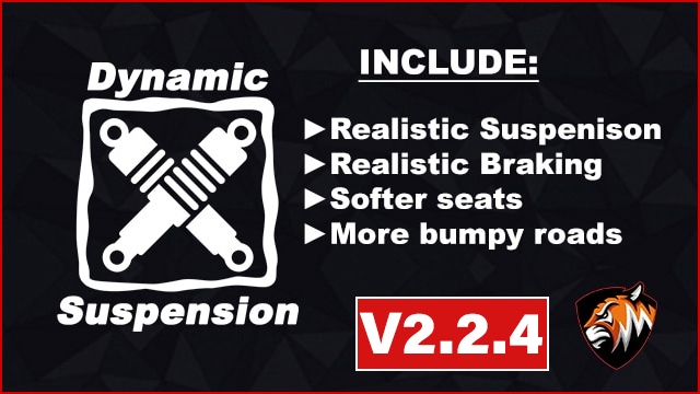 Dynamic Suspension V2.2.0 is a complete revamp for the current version of the game (1.43.x), based on community feedback that I’ve gathered for a long time. Please keep in mind that it will be available only for 1.43 and the future versions. The support for 1.42 and below versions, will be dropped. The reason is because of the changes that SCS made to the chassis in 1.43 and those will no longer work the same for 1.42 and below, especially the taglifts and midlifts. Also, all the modded trucks will be dropped because is a time consuming to re-download & to wait for the author to update them for the new changes. So, only default trucks at the moment will benefit from this update. Being a patreon, you have the posibility to request me a specific modded truck and I’ll add it in future. There is also a short tutorial below, teaching how to addapt a specific modded truck to Dynamic Suspension. So, that being said, I hope you will enjoy the new version! Changelog V2.2.4.1: – Added compatibility for Volvo VNL 2018 —————– Patch compatibility: 1.47.x; Older versions; Connection order: This mod should be set at high priority / above other physics mod! Mod compatibility: This mod should work with all default trucks and the modded ones! Modded Trucks compatibility: – International 9800i by Harven – International HX520 by Harven – Freightliner Argosy by Harven – Kenworth W990 edited by Harven – Mack R Series by Harven – Kenworth T680 – The General by Harven – Freightliner FLB edited by Harven – Modified Peterbilt 379/389 by Viper2 – On your choice! Follow the below tutorial or just request me. – SHORT TUTORIAL – 1. Extract your modded truck 2. Follow the following path: truck_name\def\vehicle\truck\truck.name\chassis 3. Open all chassis 4×2 / 6×2 / 6×4 / 8×4 and modify the following lines as below: For 4×2 residual_travel[]: 0.14 residual_travel[]: 0.10 For 6×2 / 6×4 residual_travel[]: 0.14 residual_travel[]: 0.10 residual_travel[]: 0.10 For 8×4 residual_travel[]: 0.14 residual_travel[]: 0.10 residual_travel[]: 0.10 residual_travel[]: 0.10 4. Archieve the mod and put it into mod folder & activate it in-game 5. Enjoy the Dynamic Suspension mod! Dynamic suspension settings for Keyboard / Joystick: c_rsteersens 0.75 # Recommended!!! Or you can set slider in-game on middle. g_suspension_stiffness 0.2 g_cabin_suspension_stiffness 0 g_truck_stability 0.25 g_trailer_stability 0.25 g_brake_intensity 1.0 Dynamic suspension settings for Steering Wheel: g_suspension_stiffness 0 g_cabin_suspension_stiffness 0 g_truck_stability 0.25 g_trailer_stability 0.25 g_brake_intensity 1.0 Note: If those values isn’t proper for yourself, feel free to change them. Note*: Write above setting in console (~) after load the profile. Note**: Lower value means more realistic behavior but high risk of overturn Credits: TheTiger |