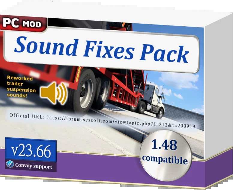 CHANGELOG v23.66.1 Compatibility update for the ETS2 1.48 open beta. [ETS2 edition] CHANGELOG v23.66 Migrated some trailer tire bump and trailer suspension noises to the trailer noise sound slider. Reworked the new trailer suspension sound effects introduced in 1.48. Slightly lower pitch for the trailer tire screech sound (easier to hear with ABS and traction control off). Engine and horn sounds added to the 2013 Kenworth T680 in AI traffic. [ATS edition] Engine and horn sounds added to the 2012 Peterbilt 579 in AI traffic. [ATS edition] Engine sounds added to the 2008-2023 Peterbilt 389 in AI traffic. [ATS edition] DESCRIPTION This mod has been bringing more immersion to common sounds in the game for over 7 years! It packs a lot of realistic sounds within one mod, making it great value within the 100 mod limit in Convoy multiplayer. COMPATIBILITY * ETS2 1.48.0 + ATS 1.48.1. No errors in game log. Must have high priority in Mod Manager. * Does not replace individual player truck sounds, so this mod can be used with an unlimited amount of truck sound mods of your choice. * Compatible with all maps and all trucks, including truck mods. * Supported in single-player and multiplayer Convoy mode, and is marked as an optional mod in Convoy. * If hosting a Convoy dedicated server with this mod, it is recommended to turn on “mods_optioning” to prevent mod version restrictions. MINIMUM REQUIREMENTS Requires higher priority in Mod Manager than: – any map mods (e.g. ProMods) – any AI traffic mods (e.g. Jazzycat’s traffic packs) – any rain sound mods (unless proven to be compatible) FEATURE LIST The mod features dynamic and realistic sounds, covering the following: – An extensive variety of suspension and tire bump sounds, including those for trailers. – Fuel / filling station sounds. – Door close and seatbelt sounds after refueling. – Train sound enhancements, including comprehensive sounds for some individual trains. – Unique railroad crossing bell sounds for different locations. – Real tire and road noise for all terrains: asphalt, gravel, grass, and sleeper lines. – Lower pitch for the trailer tire screech sound effects. – Nokia phone ringtone sound replacing the hurry up / late music, leading to less stress for the player. – Default common sound reworks, such as improved default air brake sounds and a softer default reverse beep. – AI traffic vehicle sound improvements, including sounds for Jazzycat’s Motorcycle Traffic Pack. – English UK/US voice navigation variants with speaker effect added and no unrealistic phrases. – Wind buffeting and rush of air sounds at high speeds only when the window is open. – Additional environmental and ambient sounds, and tasteful changes to existing ambient sounds in the game world. – Trailer coupling and trailer brace rotation sounds. – Two standalone air horns. – Softer mix for the Musical Road in American Truck Simulator’s Historic Route 66. – Dynamic exterior and interior rain sounds, and an assortment of varying thunder sounds with delay. – The default wiper sound may now squeak only when the windshield is dry. – Default gear grinding sound effect additions and improvements. – (Sometimes) Bug fixes for broken sounds in the vanilla game and map mods. – (Optional) Reefer / refrigerated trailer sound functionality. For further realism, the mod may also add official colors to each AI traffic vehicle it modifies for sound, with rarer colors less likely to be seen. Credits SCS Software, Drive Safely, antonvezdehod, Darkcaptain, Grinch, Kass, Katixa, Kriechbaum, Trayscapes, Vasily EVR, Zeemod Credits: Drive Safely, antonvezdehod, Darkca |