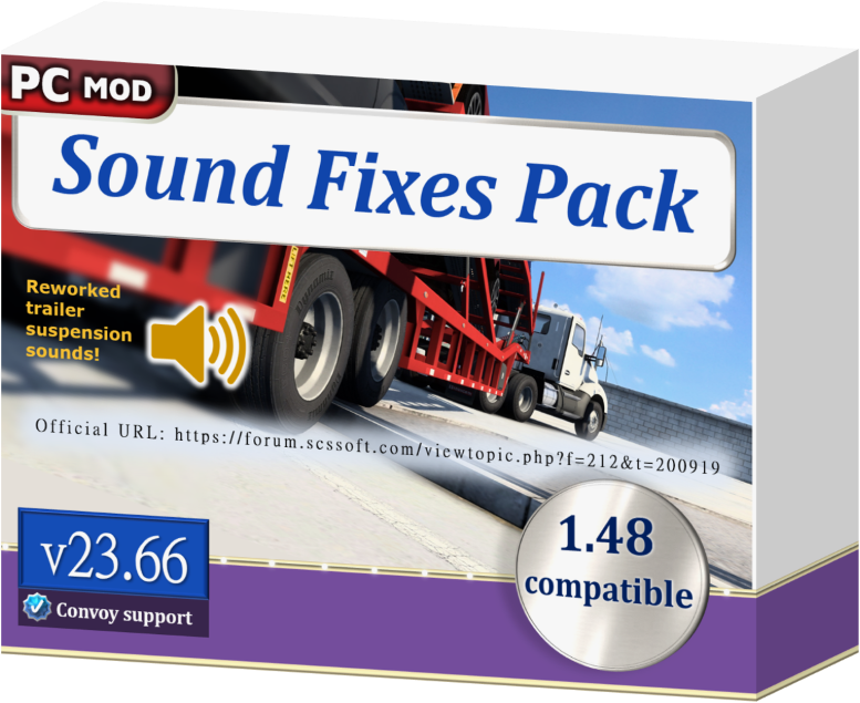 CHANGELOG v23.66 ================ Migrated some trailer tire bump and trailer suspension noises to the trailer noise sound slider. Reworked the new trailer suspension sound effects introduced in 1.48. Slightly lower pitch for the trailer tire screech sound (easier to hear with ABS and traction control off). Engine and horn sounds added to the 2013 Kenworth T680 in AI traffic. [ATS edition] Engine and horn sounds added to the 2012 Peterbilt 579 in AI traffic. [ATS edition] Engine sounds added to the 2008-2023 Peterbilt 389 in AI traffic. [ATS edition] DESCRIPTION =========== This mod has been bringing more immersion to common sounds in the game for over 7 years! It packs a lot of realistic sounds within one mod, making it great value within the 100 mod limit in Convoy multiplayer. COMPATIBILITY ============= * ETS2 1.48.0 + ATS 1.48.1. No errors in game log. Must have high priority in Mod Manager. * Does not replace individual player truck sounds, so this mod can be used with an unlimited amount of truck sound mods of your choice. * Compatible with all maps and all trucks, including truck mods. * Supported in single-player and multiplayer Convoy mode, and is marked as an optional mod in Convoy. * If hosting a Convoy dedicated server with this mod, it is recommended to turn on “mods_optioning” to prevent mod version restrictions. MINIMUM REQUIREMENTS ==================== Requires higher priority in Mod Manager than: – any map mods (e.g. ProMods) – any AI traffic mods (e.g. Jazzycat’s traffic packs) – any rain sound mods (unless proven to be compatible) FEATURE LIST ============ The mod features dynamic and realistic sounds, covering the following: – An extensive variety of suspension and tire bump sounds, including those for trailers. – Fuel / filling station sounds. – Door close and seatbelt sounds after refueling. – Train sound enhancements, including comprehensive sounds for some individual trains. – Unique railroad crossing bell sounds for different locations. – Real tire and road noise for all terrains: asphalt, gravel, grass, and sleeper lines. – Lower pitch for the trailer tire screech sound effects. – Nokia phone ringtone sound replacing the hurry up / late music, leading to less stress for the player. – Default common sound reworks, such as improved default air brake sounds and a softer default reverse beep. – AI traffic vehicle sound improvements, including sounds for Jazzycat’s Motorcycle Traffic Pack. – English UK/US voice navigation variants with speaker effect added and no unrealistic phrases. – Wind buffeting and rush of air sounds at high speeds only when the window is open. – Additional environmental and ambient sounds, and tasteful changes to existing ambient sounds in the game world. – Trailer coupling and trailer brace rotation sounds. – Two standalone air horns. – Softer mix for the Musical Road in American Truck Simulator’s Historic Route 66. – Dynamic exterior and interior rain sounds, and an assortment of varying thunder sounds with delay. – The default wiper sound may now squeak only when the windshield is dry. – Default gear grinding sound effect additions and improvements. – (Sometimes) Bug fixes for broken sounds in the vanilla game and map mods. – (Optional) Reefer / refrigerated trailer sound functionality. For further realism, the mod may also add official colors to each AI traffic vehicle it modifies for sound, with rarer colors less likely to be seen. CREDITS ======= * SCS Software for base sounds * Drive Safely for sound mixing and editing, some sound samples, and for compiling the mod * antonvezdehod and Katixa for some high speed tire sounds * Darkcaptain for a variety of thunder and rain sound samples * Grinch for the Euro Truck Simulator 2 fallback railroad crossing bell sound * Kass for a variety of thunder sound samples * Kriechbaum for blinker off stick sound and exhaust sounds from his Mack E6 engine sound mod * Trayscapes for recordings of a Mack E6 truck * Vasily EVR for some air brake sound samples * Zeemod for a wind sound sample Credits: Drive Safely |