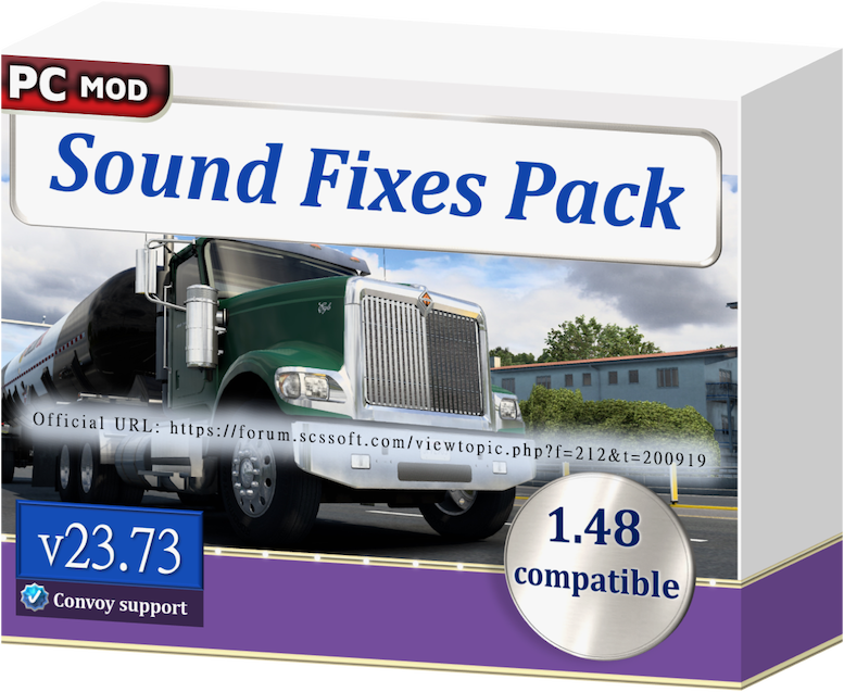 CHANGELOG v23.73 ================ Engine and horn sounds added to the civilian 2008 BMW 5-Series E60 Sedan in AI traffic. [ETS2 edition] Engine and horn sounds added to the police 2008 BMW 5-Series E60 Sedan in AI traffic. [ETS2 edition] New engine idle sound for the 2017 International 9900i Eagle in AI traffic. [ATS edition] DESCRIPTION =========== This mod has been bringing more immersion to common sounds in the game for over 7 years! It packs a lot of realistic sounds within one mod, making it great value within the 100 mod limit in Convoy multiplayer. COMPATIBILITY ============= * ETS2 1.48.1 + ATS 1.48.2. No errors in game log. Must have high priority in Mod Manager. * Does not replace individual player truck sounds, so this mod can be used with an unlimited amount of truck sound mods of your choice. * Compatible with all maps and all trucks, including truck mods. * Supported in single-player and multiplayer Convoy mode, and is marked as an optional mod in Convoy. * If hosting a Convoy dedicated server with this mod, it is recommended to turn on “mods_optioning” to prevent mod version restrictions. MINIMUM REQUIREMENTS ==================== Requires higher priority in Mod Manager than: – any map mods (e.g. ProMods) – any AI traffic mods (e.g. Jazzycat’s traffic packs) – any rain sound mods (unless proven to be compatible) FEATURE LIST ============ The mod features dynamic and realistic sounds, covering the following: – An extensive variety of suspension and tire bump sounds, including those for trailers. – Fuel / filling station sounds. – Door close and seatbelt sounds after refueling. – Train sound enhancements, including comprehensive sounds for some individual trains. – Unique railroad crossing bell sounds for different locations. – Real tire and road noise for all terrains: asphalt, gravel, grass, and sleeper lines. – Reworked tire screech sound effects. – Nokia phone ringtone sound replacing the hurry up / late music, leading to less stress for the player. – Default common sound reworks, such as improved default air brake sounds and a softer default reverse beep. – AI traffic vehicle sound improvements, including sounds for Jazzycat’s Motorcycle Traffic Pack. – English UK/US voice navigation variants with speaker effect added and no unrealistic phrases. – Wind buffeting and rush of air sounds at high speeds only when the window is open. – Additional environmental and ambient sounds, and tasteful changes to existing ambient sounds in the game world. – Trailer coupling and trailer brace rotation sounds. – Two standalone air horns. – Softer mix for the Musical Road in American Truck Simulator’s Historic Route 66. – Dynamic exterior and interior rain sounds, and an assortment of varying thunder sounds with delay. – The default wiper sound may now squeak only when the windshield is dry. – Default gear grinding sound effect additions and improvements. – Stronger reverb effects when under bridges and overpasses. – (Sometimes) Bug fixes for broken sounds in the vanilla game and map mods. – (Optional) Reefer / refrigerated trailer sound functionality. For further realism, the mod may also add official colors to each AI traffic vehicle it modifies for sound, with rarer colors less likely to be seen. CREDITS ======= * SCS Software for base sounds * Drive Safely for sound mixing and editing, some sound samples, and for compiling the mod * antonvezdehod and Katixa for some high speed tire sounds * Darkcaptain for a variety of thunder and rain sound samples * Grinch for the Euro Truck Simulator 2 fallback railroad crossing bell sound * Kass for a variety of thunder sound samples * Kriechbaum for blinker off stick sound and exhaust sounds from his Mack E6 engine sound mod * Trayscapes for recordings of a Mack E6 truck * Vasily EVR for some air brake sound samples * Zeemod for a wind sound sample Credits: Drive Safely |