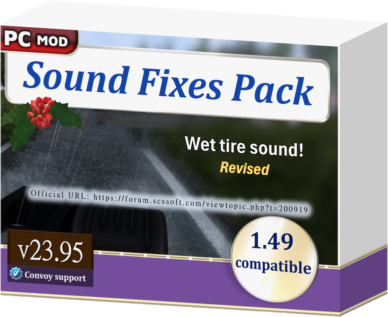 CHANGELOG v23.95 Compatibility update for ATS 1.49.2.8. [ATS edition] Engine and horn sounds added to the 2011 Ford F-450 in AI traffic (Kansas ambulance variants). [ATS edition] Quality of life improvements for the Sound Fixes Pack wet tire sound feature: – New and more seamless wet tire sound loop. – Wet tire sound loop will dynamically lower in sound volume in light rain conditions, due to the road being in a drier state. – Sound volume adjustments for the wet tire sound layer for the tire screech on asphalt roads. – Wet tire sound loop should no longer skip or have a millisecond pause in certain camera views. CHANGELOG v23.94 Lowered sound volume of wet tire sound to correct for users without soundproofing mods. DESCRIPTION This mod has been bringing more immersion to common sounds in the game for over 8 years! It packs a lot of realistic sounds within one mod, making it great value within the 100 mod limit in Convoy multiplayer. COMPATIBILITY * ETS2 1.49.2 + ATS 1.49.2. No errors in game log. Must have high priority in Mod Manager. * Does not replace individual player truck sounds, so this mod can be used with an unlimited amount of truck sound mods of your choice. * Compatible with all maps and all trucks, including truck mods. * Supported in single-player and multiplayer Convoy mode, and is marked as an optional mod in Convoy. * If hosting a Convoy dedicated server with this mod, it is recommended to turn on “mods_optioning” to prevent mod version restrictions. MINIMUM REQUIREMENTS Requires higher priority in Mod Manager than: – any map mods (e.g. ProMods) – any AI traffic mods (e.g. traffic packs and traffic pack add-ons) – any rain sound mods (unless proven to be compatible) FEATURE LIST The mod features dynamic and realistic sounds, covering the following: – An extensive variety of suspension and tire bump sounds, including those for trailers. – Fuel / filling station sounds. – Door close and seatbelt sounds after refueling. – Train sound enhancements, including comprehensive sounds for some individual trains. – Unique railroad crossing bell sounds for different locations. – Real tire and road noise for all terrains: asphalt, gravel, grass, snow, and sleeper lines. – Wet tire noise for the player’s truck tires when the asphalt roads are wet. – Reworked tire screech sound effects. – Nokia phone ringtone sound replacing the hurry up / late music, leading to less stress for the player. – Default common sound reworks, such as improved default air brake sounds and a softer default reverse beep. – AI traffic vehicle sound improvements. – English UK/US voice navigation variants with speaker effect added and no unrealistic phrases. – Wind buffeting and rush of air sounds at high speeds only when the window is open. – Additional environmental and ambient sounds, and tasteful changes to existing ambient sounds in the game world. – Trailer coupling and trailer brace rotation sounds. – Two standalone air horns. – Softer mix for the Musical Road in American Truck Simulator’s Historic Route 66. – Dynamic exterior and interior rain sounds, and an assortment of varying thunder sounds with delay. – The default wiper sound may now squeak only when the windshield is dry. – Default gear grinding sound effect additions and improvements. – Stronger reverb effects when under bridges and overpasses. – (Optional) Reefer / refrigerated trailer sound functionality. – (Optional – ATS only) Cop scouting reports via CB radio (enable in voice navigation options). For further realism, the mod may also add official colors to each AI traffic vehicle it modifies for sound, with rarer colors less likely to be seen. CREDITS SCS Software for base sounds * Drive Safely for sound mixing and editing, some sound samples, and for compiling the mod * antonvezdehod and Katixa for some high speed tire sounds * Darkcaptain for a variety of thunder and rain sound samples * Grinch for the Euro Truck Simulator 2 fallback railroad crossing bell sound * Kass for a variety of thunder sound samples * Kriechbaum for blinker off stick sound and exhaust sounds from his Mack E6 engine sound mod * Trayscapes for recordings of a Mack E6 truck * Vasily EVR for some air brake sound samples * Zeemod for a wind sound sample Credits: Drive Safely |