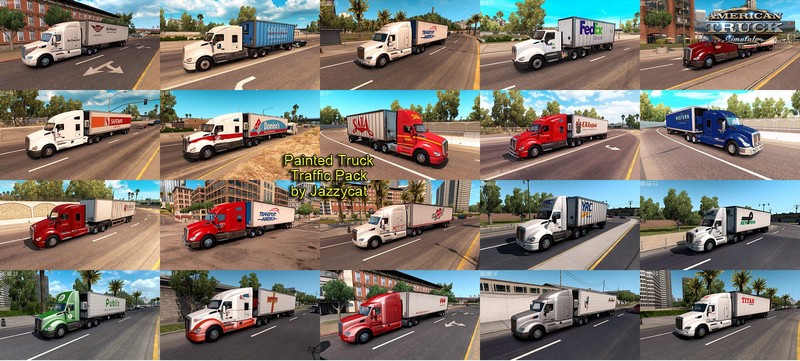 Pack adds in traffic 46 new trucks: Freightliner Argosy, Century, Classic, Coronado, Cascadia, M2 International 9200, 9400 Kenworth T440, T600, T800, T2000, K100, T880 Mack 613 Dumper, Titan Peterbilt 378, 379, 387 Sterling 9500 Volvo VNL660 Western Star 4900 GMC Topkick C5500 CAT CT660 and some others. All standalone, works on any maps. Compatible with all my packs. Some skins by VisualParadox. For ATS version 1.41.x, 1.42.x beta Version 2.8.1 – fixed wrong mapping for Kenworth truck, optimized lods for Peterbilt Tank Truck and Cement Truck Credits: JC |