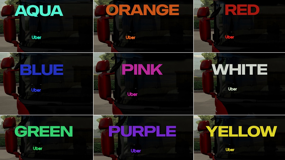 - English - This mod add the UBER led light to all scs trucks and + than 150 truck mods. It has 9 different colors being them: -Aqua -Blue -Green -Orange -Pink -Purple -Red -White -Yellow By Leozin :) - Português - Esse mod adiciona o luminoso de led UBER para todos os caminhões da scs e + de 150 mods de caminhões. Possui 9 cores diferentes sendo: -Ciano -Azul -Verde -Laranja -Rosa -Roxo -Vermelho -Branco -Amarelo Feito por Leozin :) Credits: Leozin |