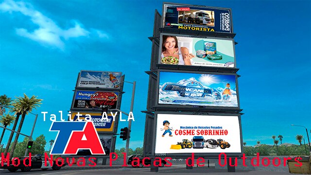 [PR] O mod que muda as propagandas dos outdoors nas ruas e rodovias da American Truck Simulator. são 114 anúncios diferentes, Brasileiro incluindo várias empresas e organizações, foram adicionados.incluindo alguns amigos Lembrete: Dê alta prioridade a este mod no gerenciador de mod ao usá-lo com mods semelhantes! [EN] The mod that changes billboard advertisements in streets and highways from American Truck Simulator. there are 114 different ads, Brazilian including several companies and organizations, have been added. Reminder: Give this mod high priority in mod manager when using it with similar mods! Credits: Talita Ahüva Barüc Hadeell |
