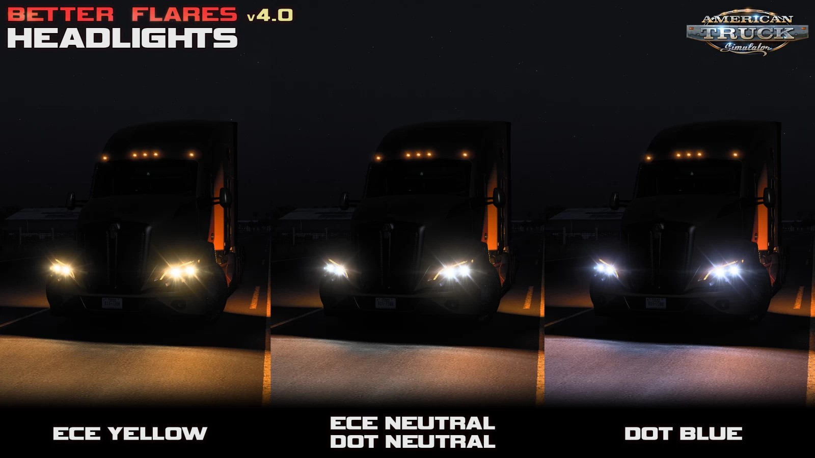 Version 4.0 is a revival of my long-abandoned mod of the same name, which ended on version 3.2 but was updated for some time Unfortunately, due to inactivity, the original 3.2 topic was deleted, so I had to create a new one. Key features: – Completely reworked flares – Realistic headlights patterns (up to 50 modded trucks supported) – Modified SCS AI traffic with 9 headlights color variants and 2 red/brake signals IMPORTANT! Place TRAFFIC ADDON at the very bottom of Mod Manager, below other mods to avoid errors and crashes Credits: Avelium |
