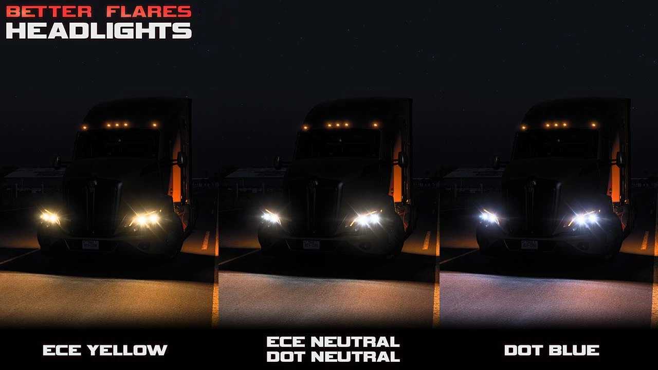 – Realistic headlights patterns with 3 different colors (up to 50 modded trucks supported)