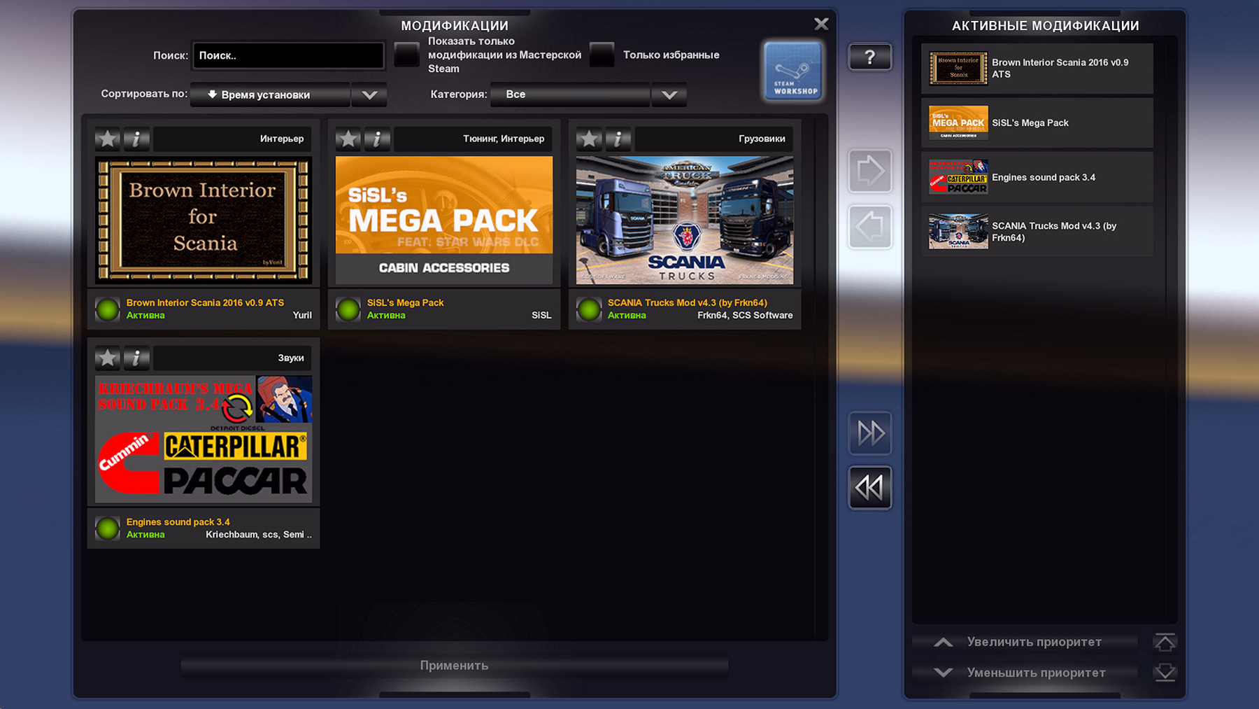 For Scania S 2016, Scania R 2016. Requires "Scania Trucks Mod" Requires "ATS Sound Pack" (Krichbaum) It is desirable to install "SiSL's Mega Pack" Credits: YuriI |