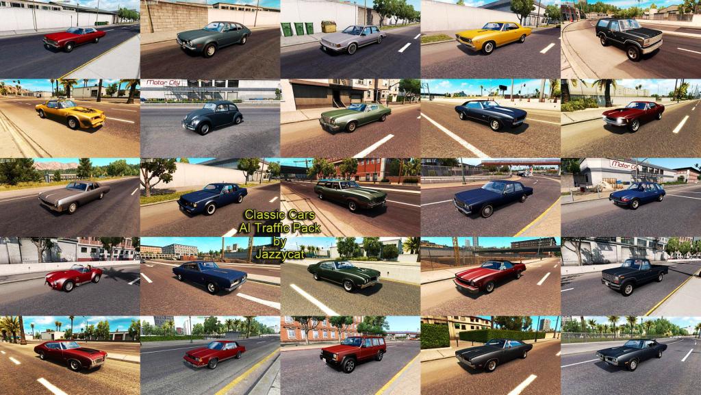 Version 4.2 - added Mercury Cyclone '70 and Chevrolet Nova Wagon '64 Pack adds in traffic 76 new AI cars: Chevrolet Camaro ('69, '79), Caprice '86, El Camino '73, Chevelle '67, Impala('67, '84), Silverado K-10 '86, Chevy II '66, Monte Carlo '86, Corvair '69, K5 Blazer '86, Nova '69, Astro '88 Dodge Charger R/T '69, Monaco '74, Polara '71, Challenger '70, Super Bee '70, Dodge Coronet '67, Dart '68, Diplomat '85, Mirada '83 Ford Mustang ('65, '70), Gran Torino '74, Pinto '71, Bronco '80, F150 '84, E250 '79, Thunderbird '57, Country Squire '66, Granada '81 Oldsmobile 442 '70, Vista Cruiser '72, Delta 88 '73, Cutlass Supreme Classic '88 Pontiac Firebird('68, '78), Tempest '65, Fiero '88, GTO '69 Buick Skylark GSX '70, Regal '87, Century '86 Plymouth Barracuda '68, GTX '71, Volare '79, Road Runner '69, Belvedere '66, Fury '69, Valiant '62, Satellite '66, Duster '71 Mercury Cougar '70, Grand Marquis '86, Cyclone '70 Cadillac Eldorado Biarritz '59, Fleetwood Brougham '85 Chrysler New Yorker '71 Lincoln Continental '62 GMC Sierra 1500 '88 Jeep Cherokee '84 AMC Pacer, Javelin '71, Gremlin '73 Winnebago Chieftain '73 AC Cobra Delorian DMC-12 Subaru BRAT '81 Triumph TR3 Volkswagen Beetle '63, Type 2(T1), Rabbit Mercedes-Benz 300SEL '72 All standalone, works on any maps. Compatible with all my packs. For ATS version 1.35.x Credits: JAZZYCAT |