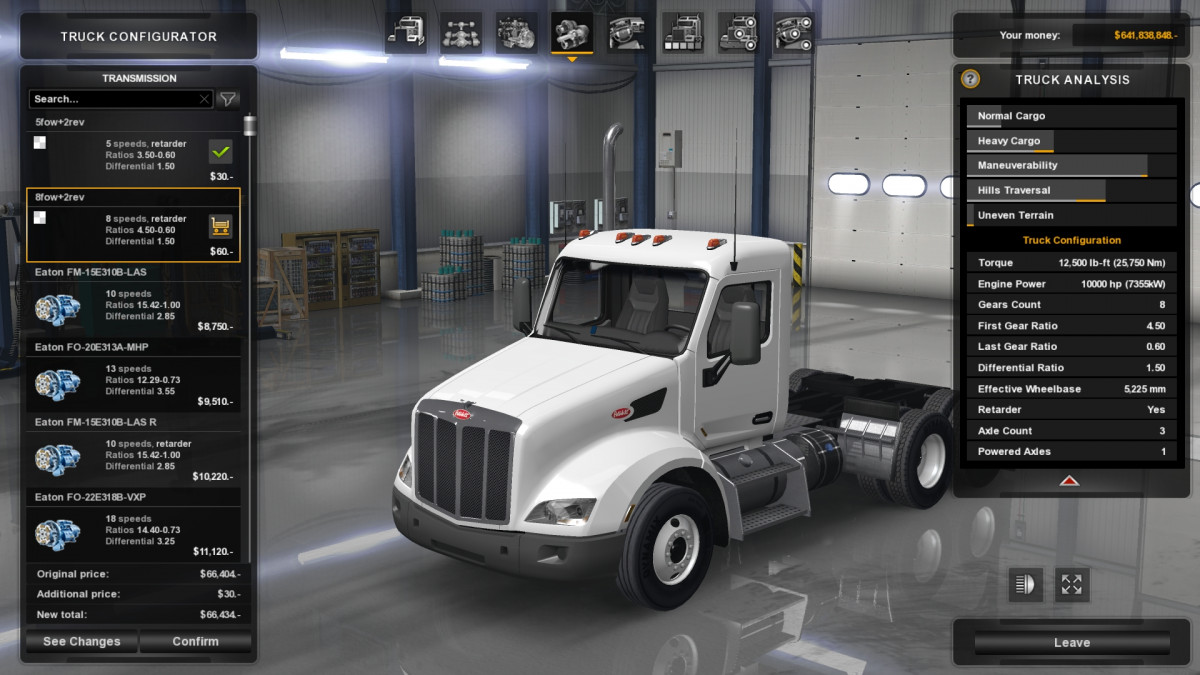 A powerful engine with a 2 tramsmissions that can reach up to 350 kmph The engine has 10000 horsepower and 22500 lb-ft torque Unlocks at 0 level Price is 49$ The first transmission has differential ratio of 1.50 5 forward gears and 2 reverse You can go 100 kmph in 1st gear Top speed over 350 kmph I added 5ft gear for fuel economy, so you can cruise in it Retarder steps: 6 Unlocks at 0 level Price is 30$ Second transmission has differential ratio of 1.50 8 forward gears and 2 reverse Top speed over 300 kmph Retarder steps: 3 Unlocks at level 0 Price is 60$ You can use this setup to travel fast between cities, but you have to install no damage mod Tested version: 1.31.x Compatible with other mods. Credits: la1nar Credits: la1nar |