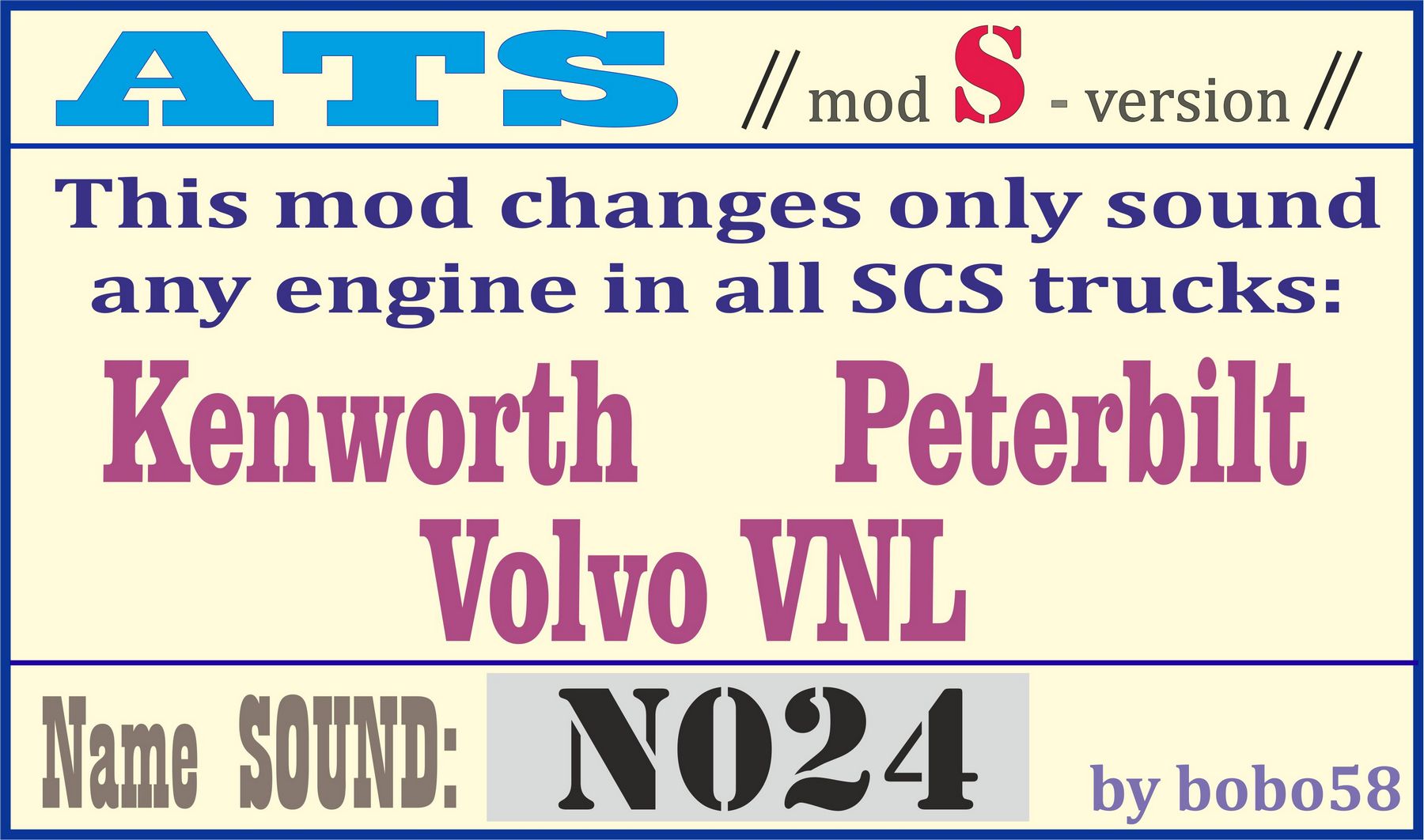 sound mod: << KPV_Engine_Sound-S.N024_v.26.12.2018.scs – Mod S-version changes the sound of any engines in all SCS trucks for ATS. These mods for SCS trucks in ATS, list trucks: – Kenworth W900 – Kenworth T680 – Peterbilt 389 – Peterbilt 579 – Volvo VNL ____ USER MANUAL: ATTENTION! These mods do not change the game process. You can use mod at any time, it’s enough to leave the game and connect – disconnect or replace mod of S-version then continue the game. For correct operation, use any one, but only one mod. When creating this mods, were used parts of mods – Kriechbaum, adi2003de, Oxygen, Drive Safely, Piva and other mods, authors I do not know. bobo58 / 26.12.2018 Credits: bobo58 Credits: bobo58 |