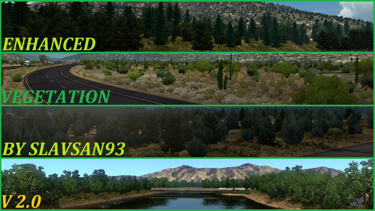 This mod replaces textures for vegetation around the map of ATS. If you like taking cool pictures and want to take a fresh look at the world of ATS, then this mod is for you! All vegetation textures have been sharpened and saturated, plus a new texture for a tree model. FYI: the screenshots for this mod have been taken without graphics mods, brightness set on 40% and Color Correction turned on. Alongside with my other mods: New Mountain Textures, Realistic Roads and New Mexico Mountain Textures. In verision 2.0: – Re-touched vegetation for New Mexico – Tweaked some other textures for trees and grass In previous versions: – Spruces are a little brighter – Some desert grass is desaturated – New textures for water and ocean waves – New texture for a tree model most commonly used around the game world (ash tree textures) – All vegetation textures have been sharpened, saturated and color corrected for a more realistic look – Spruces in the forests now have a little darker tone – Saguaro Cactus has been brightened – Cypress Arizona tree now has a little dark blue-ish tone – Palo Verde tree now has a bright green tone – Some desert grass has been paled a little Feel free to check out this mod on Steam Workshop. Compatible with New Mexico DLC (or any other DLC) Works with map mods. Tested on ATS version 1.29, 1.30 and 1.31 Credits: slavsan93 Credits: slavsan93 |