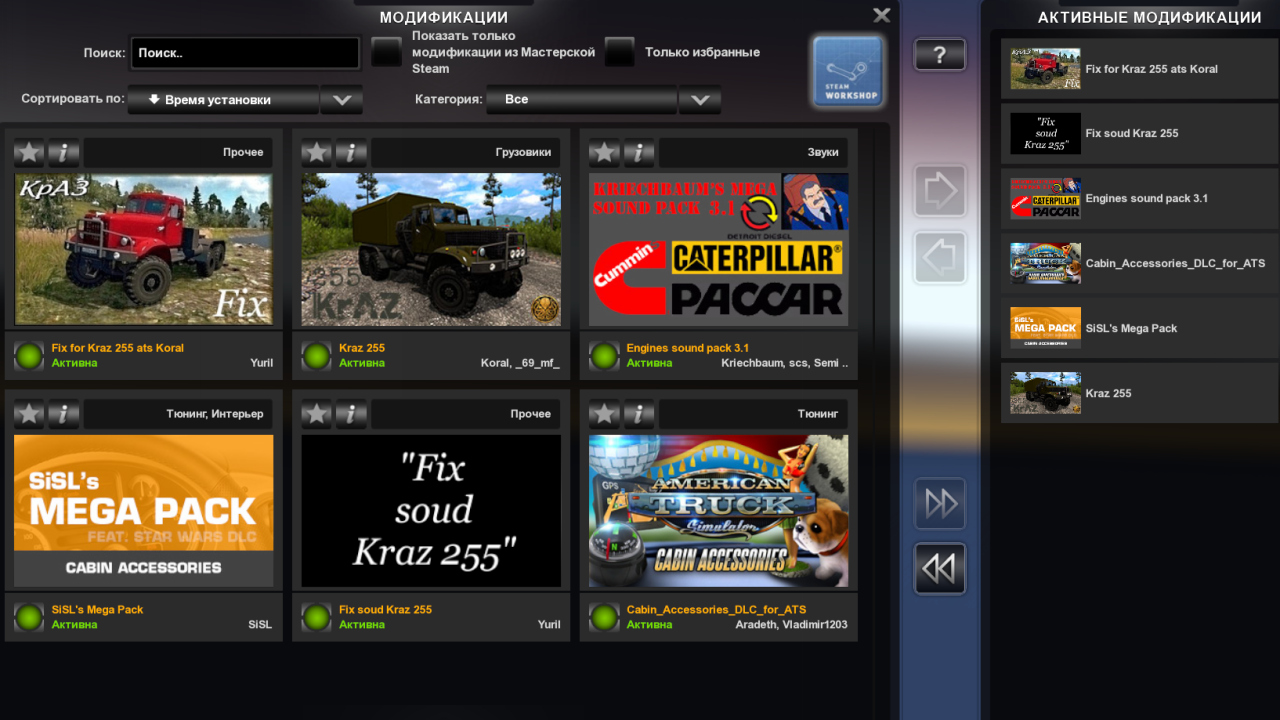 For KrAZ 255-258. Added a KrAZ dealer. Dark plastic in the interior and other photos. Added to all types of orders. Other switch sounds. The sound of a horn and a pneumatic horn. (no window animation) It is advisable to disable the advanced trailer coupling. addon for "ATS Sound Pack" 3.1 (Kriechbaum). Credits: YuriI |