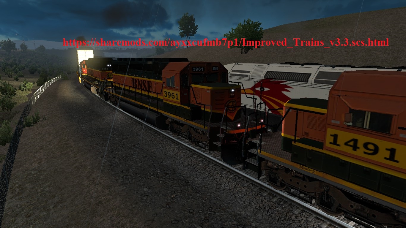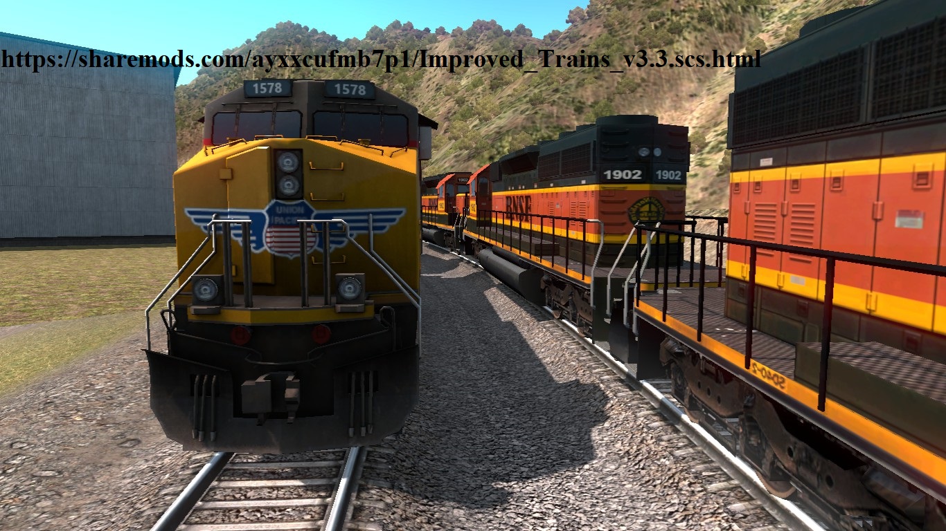 This Mod adding a More realistic American Trains by PIVA, AlexeyP. In combine With improved Train Sounds by TruckerKid and Drive Safely. + my Exclusive content. For some locomotives and rail cars add skins with logos of real companies. Now all freight trains are drived by more locomotives, from 2 to 5 coupled head DMUs and some additional in the mid and the end of the trains. The length of trains has been changed, passenger: 4-10 cars. freight: 20-60 cars, depending on the number of sections and type of locomotives. The max speed of freight trains: 80 KM/h. Passengers: 150 KM/h. (NOT MILES!) Added sounds for trains from the Sound Fixes Pack and Improved Train Sounds All passenger trains added a reverse section locomotive. increased stopping distance for the all trains. Changes in version 3.3 for ATS (v1.36x): Add skins with unique own numbers of different DMU engines. Add Caboose. Add missing flares to locomotives. Change cam settings in mode 2 !!!EXPEREMENTAL!!! Add sounds to additional DMU’s and trail cars. May working incorrectly (alpha version). Add Exhaust smoke particles for engines (can reduce FPS, i tried to use heavy black smoke but it make game as slide show)) history of versions: Changes in version 3.2 for ATS (v1.35x)(OLD): THE TRANSFER PROBLEM IS SOLVED NEAR THE RAILWAY CROSSINGS AND RAIL STATIONS. Now freight trains do not stop there and do not block the next crossings. Completely redone 3D models. Added new 3D models of additional Locomotives for all train types. All 3D models are taken from the original game and redesigned for the mod. All 3D models have LODs added to reduce graphical load and FPS drawdown. Now even more options for a locomotive couplers. Cars groups in freight trains are more randomly from 2 to 8 cars in group. Please place this mod above any Sounds and Traffic Density mods in manager. Attention! DISTRIBUTION ON THE OTHER SITES IS ALLOWED ONLY WHEN SAVING A ORIGINAL LINK TO SHAREMODS.COM AUTHOR PAGE (look for the author’s nickname “POWERFULL” on the file storage page before downloading) THE WORK OF ANY REUPLOADED BY THIRD PARTY COPIES IS NOT GUARANTEED. MOD IS PACKED IN THE ARCHIVE IN SPECIAL WAY, ANY REPAIR WILL RESULT IN ERRORS AND BUGS This mod must be placed above any other third party mods that affect the trains, except for my own addons and graphic mods that change the skins or appearance of trains. I recommend using this mod with mods, Traffic Density and Ratio by Cip, Sound Fixed Pack by Drive Safely and Realistic Vehicle Lights by Frkn64 (the last mod can be put higher than improved trains) The Mod is not compatible with any other Trains mods! The mod does not support versions of game older than (1.36x). The presence or absence of any DLC does not affect the mod. When testing in ATS (1.36), together with the known reliable mods, the log was clean, without errors. It should not conflict with mods that do not affect trains, since it only affects trains and only them. With this mod keep the value of “g_traffic 1.0″ and not increase this value” (I can’t help check your bugs if your “g_traffic” value is increased by more than “1.0”) Credits: 3D modelling: SCS, PIVA, AlexeyP, POWE®FULL. Sounds:SCS, TruckerKid, Drive Safely. Compilation: POWE®FULL Skins:SCS, PIVA, Grimes, Eddie Yantz, POWE®FULL. I’M VERY THANKFUL OF THE AUTHORS for all these materials! Enjoy it and Have Fun! Credits: POWE®FULL™ |