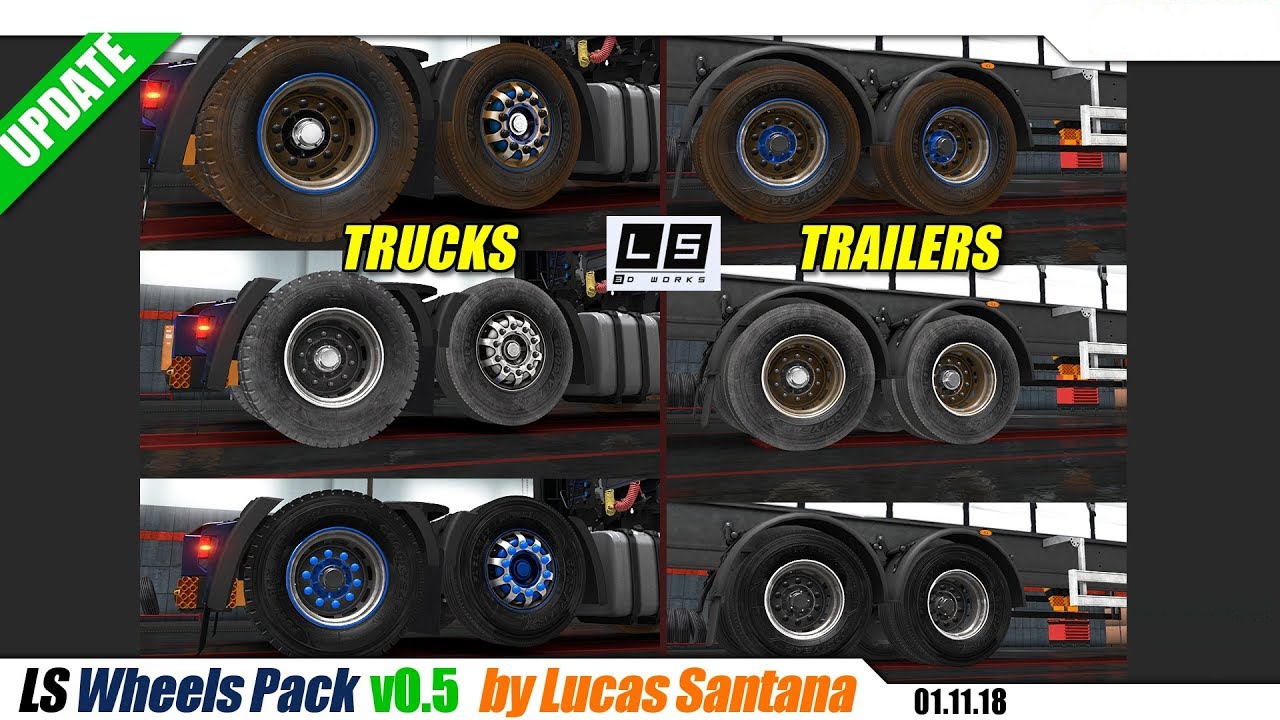This mod adds wheels and accessories, Focusing on the Brazilian style. Content: Wheel Model: ItalSpeed GT 1 – 3 rear and front variants with plus 3 types of textures clean, dirty and dusty. Alcoa LvL ONE – 3 rear and front variants with plus 4 variants: Standard, polished, urban dirt and dust. Steel 22.5×8.25 – 4 rear and front variants. Alcoa Ultra ONE – 2 rear and front variants: Standard, polished. Hubs: Scania 5 series front hubs with 3 variants. Rear Scania hubs WIP DAF front and rear hubs with some variants . Auxiliary Hub with variants. Tyres: Good Year Max Fuel LHS and LHD.With 4 variants: Standard, polished, urban dirt and dust. Credits: Erico Rafael,Sérgio Murilo ,Lucas Santana Credits: Erico Rafael,Sérgio Murilo ,Lucas S |