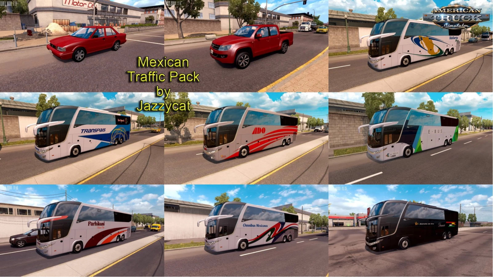 Pack adds in traffic vehicles for Mexican maps: Volkswagen Amarok, Saveiro, Gol, Up, Polo, Pointer Pickup Renault Fluence, Captur Peugeot 208, 508, 308, 2008, 3008 Toyota Hilux Ford Ecosport Chevrolet Tornado, Corsa Seat Ibiza, Leon Nissan Tsuru, March Mitsubishi L200 Mercedes-Benz Sprinter, A-Class Fiat Uno Alfa Romeo Giulietta Suzuki SX4 trucks, trailers and buses with mexican skins. All standalone. Compatible with all my packs. For versions 1.41.x Some skins by Alex Valenmar, Samdeb, Pistianzer, DigitalBusMX, Landsky, Andres Melendrez, Pequeshiro, mexican_scientist. For Mexican vehicles only on Mexican maps you must have in mod folder 2 files: Mexican_Traffic_Pack_by_Jazzycat_v2.5_base.scs Mexican_Traffic_Pack_by_Jazzycat_v2.5_mexico.scs For Mexican vehicles everywhere only 1 file: Mexican_Traffic_Pack_by_Jazzycat_v2.5_base.scs Version 2.5 – added Peugeot 2008 ’20 and Peugeot 3008 ’17 Credits: JC |