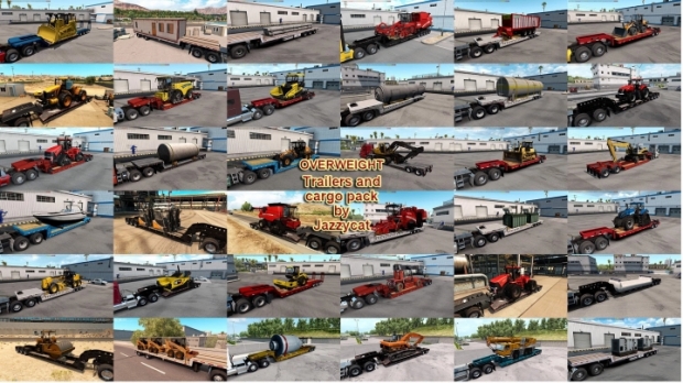 Pack adds in game new overweight trailers with new cargo. All standalone. Works on any maps. For ATS version 1.43.x Compatible with all my packs, except trailers and cargo pack. Models and skins by SCS Software, Giant Software, SoftLab, Astragon Software, Polygonish, Cape, Bruno77, Bora, Hardtrucksthebest, Rubberduck, Mavis, Sherry0, Tony1971, luder, bayonet, petercar379, KMN Modding, Smarty, TruckSim, Ivan, Dogebilt, Brown Modding, Technicmods, Jura2470, Dietz Modding, bansheewoj, Bcbuhler, DocElyoc, Jessy, CaMOnLy, Habdorn For english version you must have in mod folder two files: overweight_trailers_and_cargo_pack_by_Jazzycat_v4.7.2_ats_base.scs overweight_trailers_and_cargo_pack_by_Jazzycat_v4.7.2_ats_eng.scs Attention! This pack is part of my Trailers and cargo pack. Don’t use them together! Version 4.7.2 – compatibility update for game version 1.43 Credits: JC |