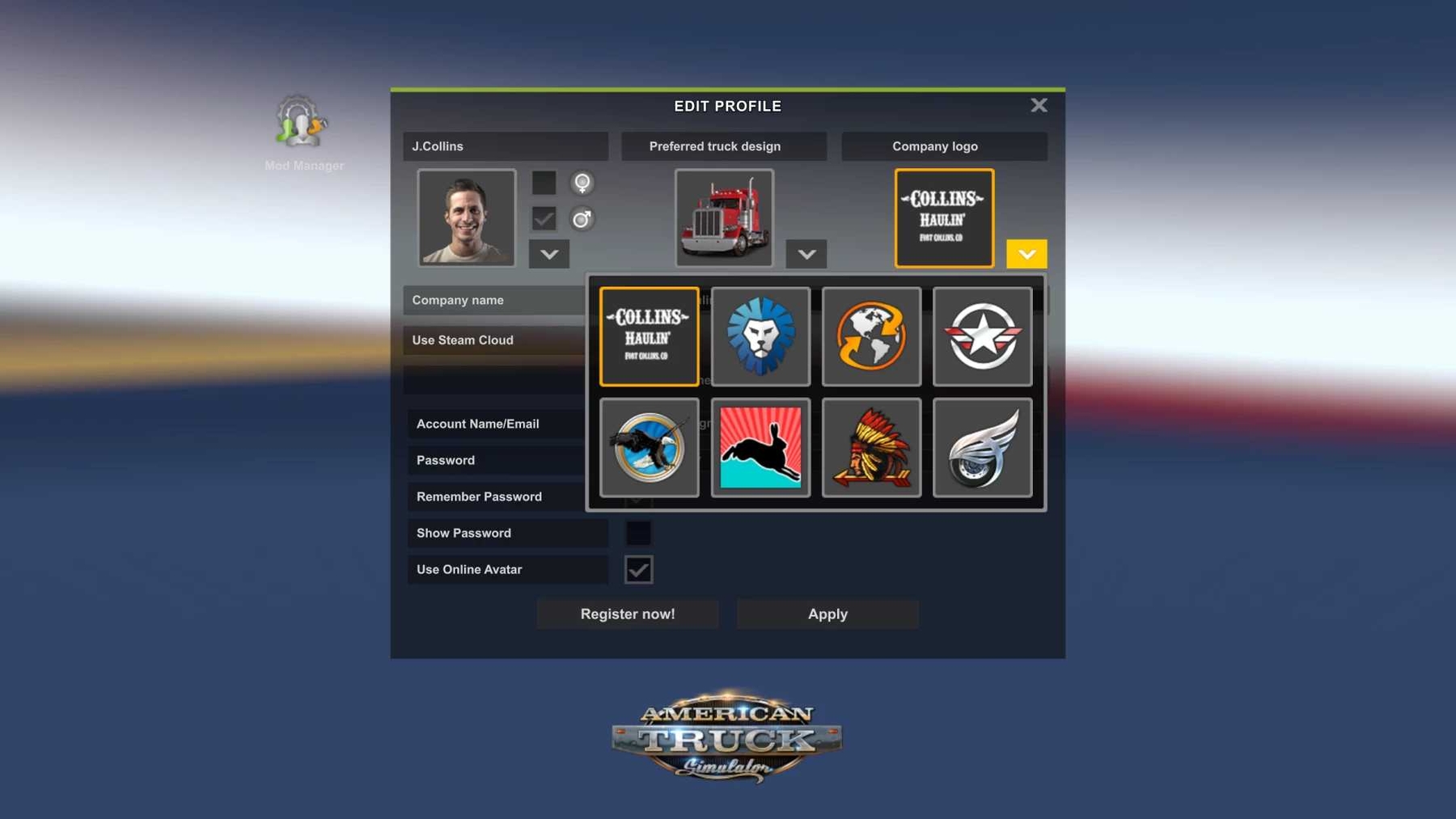 ATS v1.47+ This sample mod allows you to put your own custom logo into the game. 92px X 92px .DDS file 3 Backgrounds (Transparent/Black/White) Credits: Dhjays13 |
