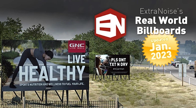 The mod updates (most) of the billboards around the map to use real world billboards. I enjoy other real world graphics mods but have been wanting to see some new billboards lately that feature more updated billboards from 2021-2023 and also wanted to ensure that billboards represented their regions (to the best of my ability). To accomplish this, I began making notes of where each instance of a billboard would appear and then tried to map companies to those locations, if they would advertise there. Some billboards look professional. Some look ugly. Some are wacky or are designed to make you laugh. Some are PSAs. I did not want to include overtly political messages, so those kinds of billboards have been left out in favor of focusing on commercial-type advertising. Some billboards include subtle jokes that I’ve added, but they’re not meant to distract from reality and you (hopefully) won’t notice them unless you study them closely. As this just swaps out texture files (for now), it should be compatible with almost all other mods. However, to ensure that you see these billboards in the game, make sure that this mod is loaded above other similar-type mods. For game version 1.46.x Credits: ExtraNoise Credits: ExtraNoise |