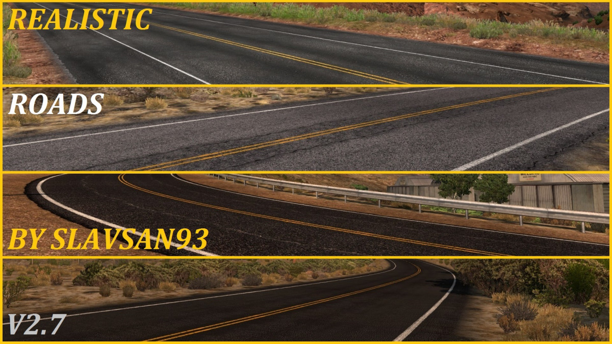 This mod replaces textures for the roads around the map of ATS. If you like taking cool pictures and want to take a fresh look at the world of ATS, then this mod is for you! Most of the road textures are new and are made based on the real world pictures. FYI: the screenshots for this mod have been taken without graphics mods, brightness set on 40% and Color Correction turned on. Alongside with my other mods: Enhanced Vegetation, New Mountain Textures and New Mexico Mountain Textures. I really recommend you use all of the mentioned mods together for the best experience ;) New in v2.7: – New fresh asphalt textures – Cracked gray asphalt textures are corrected – New dark granulated asphalt with lengthwise cracks – Light gray asphalt texture is reworked – Some other corrections for road textures In previous versions: – Compatibility with game version 1.31 – Concrete asphalt texture for some roads in New Mexico (new texture) – Dark semi-worn asphalt (new texture, revived from a previous version) – Bright worn asphalt with some cracks (new texture). I reworked this one as it used to be a bit contraversial and didn’t quite match to some people’s (and my) liking. – Some corrections for other road textures – Dark gray asphalt (new texture) – Dark gray asphalt with minor lengthwise cracks (reworked) – Gray – dark gray asphalt (2 versions, new texture) – Dusty brown old asphalt (new texture) – Dusty brown old asphalt with cracks (new texture) – Light gray asphalt with patched cracks (reworked) – Two new textures for sidewalks – Reworked textures for road shoulders – Some other texture corrections – New, reworked textures for all roads in the game, with different kinds of asphalt – Dark gray asphalt (reworked default texture, sharpened and darkened) – Dark gray asphalt with minor lengthwise cracks (reworked default texture, sharpened and darkened) – Dark gray asphalt with semi-worn pavement (new texture) – Gray, worn, good quality pavement (new texture) – Semi-worn gray asphalt (new texture) – Light gray, high quality pavement (new texture) – Light gray pavement with minor lengthwise cracks (new texture) – Light gray pavement with a lot of patched cracks (new textrure) Compatible with New Mexico DLC (or any other DLC) Works with map mods. Tested on ATS version 1.31, 1.32 and 1.33. Credits: slavsan93 Credits: slavsan93 |