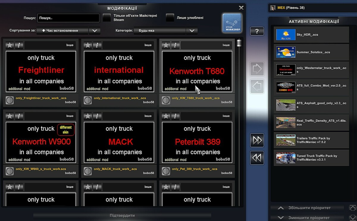 ATTENTION! I made these mods for myself and maybe you don't need it. American Truck Simulator ver.1.49 Combo mod and a set of mods for it. This version of the set of mods from 27.11.2023 (with minor fixes) Below is a set of mods for employment as a driver at SCS in ATS mod: ATS_full_Combo_Mod_ver.2.0_.scs this mod is the main one for working in any SCS company as a trucker additional mods: mod: only_Freightliner_truck_work_.scs ---- this mod set only truck Freightliner in all companies SCS ATS mod: only_Freightliner_truck_work_.scs ---- this mod set only truck International in all companies SCS ATS mod: only_KW_T680_truck_work_.scs ---- this mod set only truck KW_T680 in all companies SCS ATS mod: only_KW_W900_s_truck_work_.scs ---- this mod set only truck KW_W900 in all companies SCS ATS mod: only_MACK_truck_work_.scs ---- this mod set only truck MACK in all companies SCS ATS mod: only_Pet_389_truck_work_.scs ---- this mod set only truck Pet_389 in all companies SCS ATS mod: only_Pet_579_truck_work_.scs ---- this mod set only truck Pet_579 in all companies SCS ATS mod: only_VOLVO_2018_truck_work_.scs ---- this mod set only truck VOLVO_2018 in all companies SCS ATS mod: only_Westernstar_truck_work_.scs ---- this mod set only truck Westernstar in all companies SCS ATS ATTENTION! To work correctly, use any, but only one additional mod from this series. author: bobo58 // 27.11.2023 Credits: bobo58 |