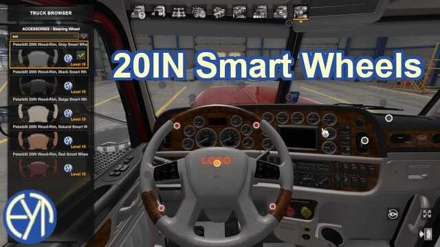 Update: 27 May Added SCS’ VNL(2018) Description: . . . modeled after an SCS’ “Exclusive” steering wheel. These steering wheels have 20IN / 500mm diameter so more of the dash is visible (SCS’ steering wheels are 18IN / 460mm), They have a wooden rim; the leather-textures are available in colors: beige, black, blue, gray, natural, and red. They have the manufacturers’ logo of the truck you’re using. Spinners added that work on every truck with spinner slots (not just wheels in this mod). Credits: Yantz |