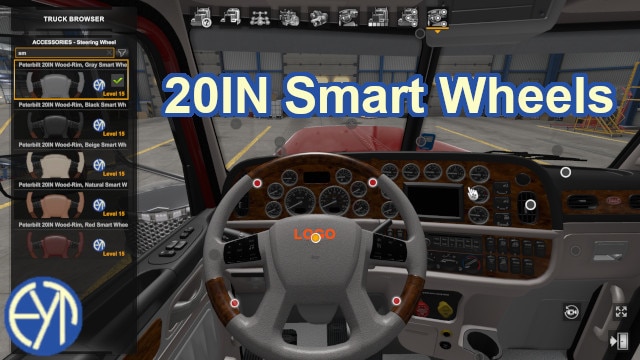 Update v1.1: added in four GTM trucks from the workshop . . . modeled after an SCS' "Exclusive" steering wheel. - these steering wheels have 20IN / 500mm diameter so more of the dash is visible (SCS' steering wheels are 18IN / 460mm), - they have a wooden rim; the leather-textures are available in colors: beige, black, blue, gray, natural, and red. - they have the manufacturers' logo of the truck you're using. - spinners added that work on every truck with spinner slots (not just wheels in this mod). Credits: Eddie Yantz |