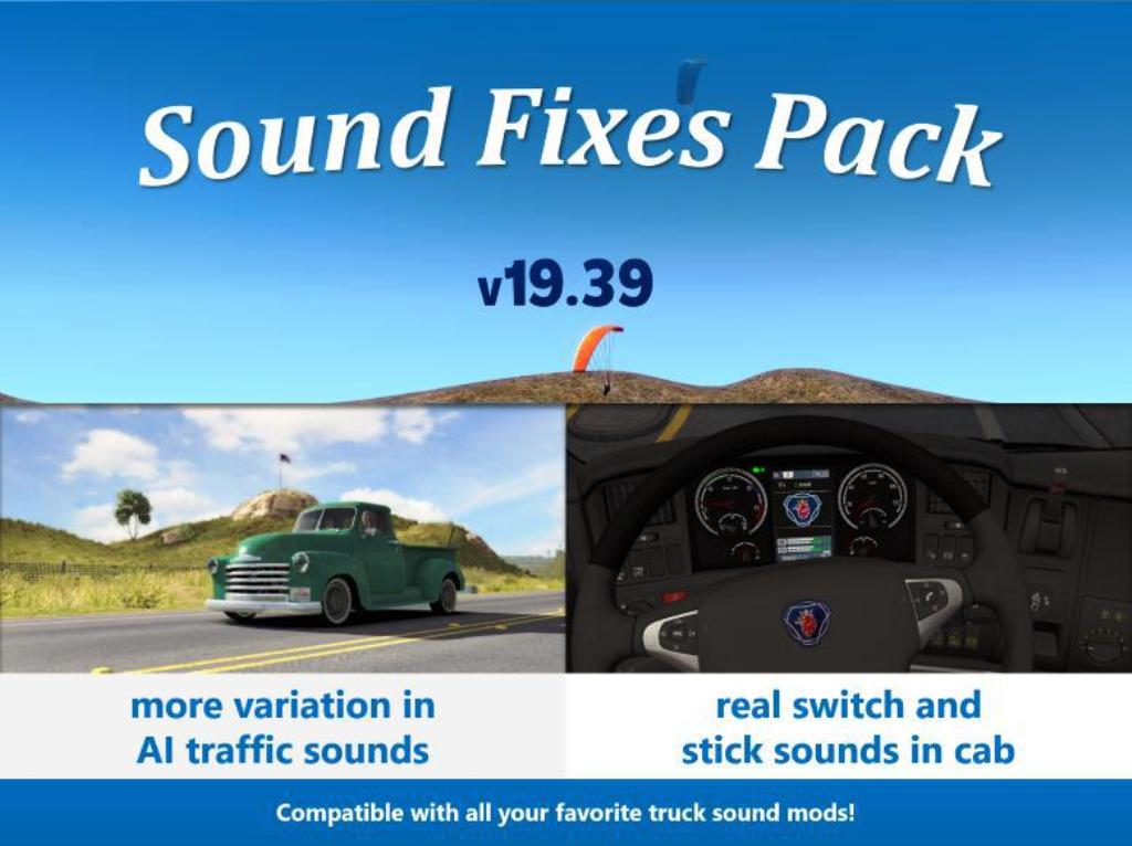 Change log 19.39 Compatibility update for the open beta version 1.36.0. The sound setting for the sounds of the glider. [ATS edition] Applied real engine + real horn sounds for new trucks in jazzycat's Painted Truck Traffic v2.7 package. [ATS edition] Applied real engine + real horn sounds for new trucks in jazzycat's Painted Truck Traffic V9.0 package. [ETS2 edition] Important: For those using older versions of Jazzycat's Painted Truck Traffic Pack (ETS2), upgrade to version 9.0 to ensure full compatibility. DESCRIPTION =========== - Pack provides improvements to the overall sounds in the game. Includes euphonic, relaxing and real sounds. - The goal of the mod is to make the sounds of the game feel like in real life. The mod will have regular updates to cover more sounds to add immersion. Therefore, the Steam Workshop version is highly recommended for a faster upgrade. Authors: Drive Safely, antonvezdehod, Ludmilla, Katixa/Irreo, Balamut, AlexeyP, cipinho, kriechbaum, Slider_556, Vasily EVR Credits: - |