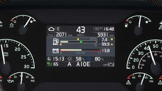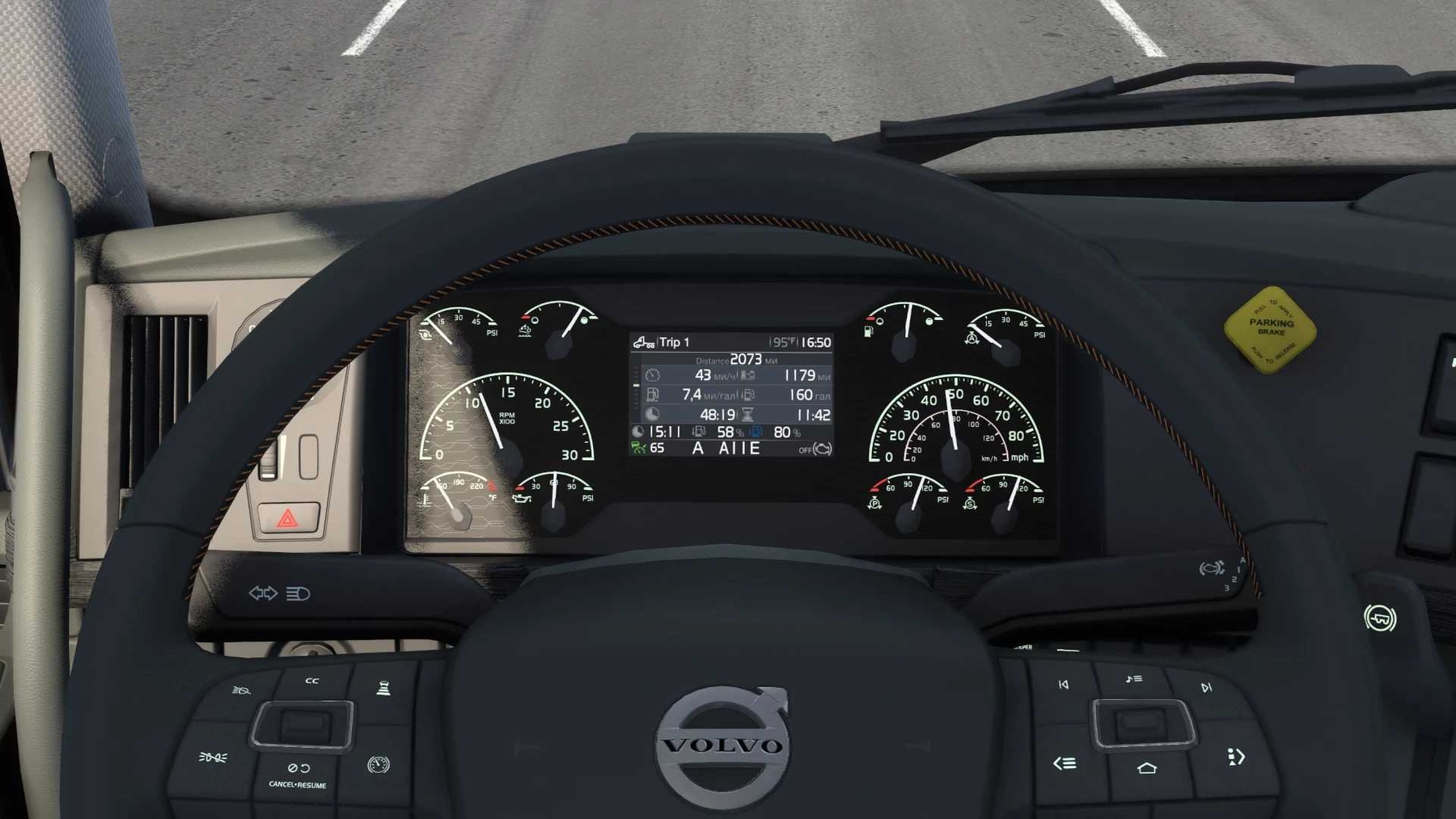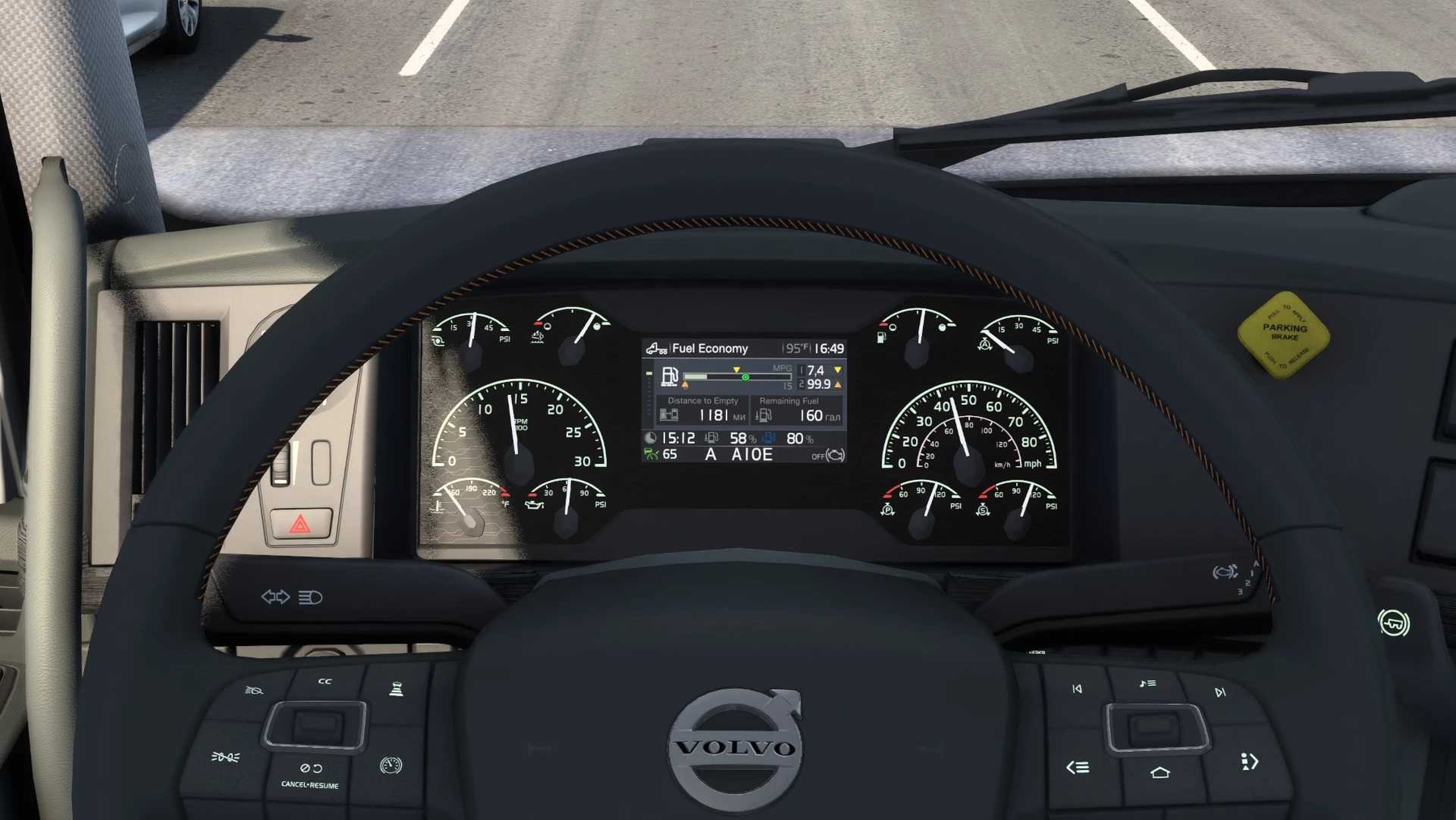 This mod improves Volvo VNL 2018 Dashboard: – added retarder icon; – added cruise control memory icon; – added remaining fuel/adblue in tank percent; – added ETA (estimated time to arrival) indicator, hidden when time is not available (no delivery, no navigation, etc.); – fixes and improvements. Credits: KnightRider |