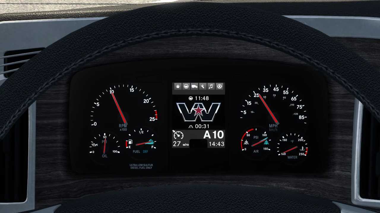 This mod improved SCS Western Star 49X dashboard: – added current speed indicator; – added remaining fuel in tank indicator; – added guessed operating range of vehicle indicator; – added remaining fuel in tank percent indicator; – added remaining adblue in tank percent indicator – added retarder icon; – added pages “Fuel” and “Time”; – added ETA (estimated time to arrival) indicator, hidden when time is not available (no delivery, no navigation etc.); – added time until rest is needed indicator, hidden when fatigue option is disabled; – added page with logo “Westernstar”; – changed soot level indicator and icon; – changed cruise control activation indicators group; – changed transmision gear indicator; – removed pages “Diesel Particulate Filter” and “Engine”. Credits KnightRider Credits: KnightRider |
