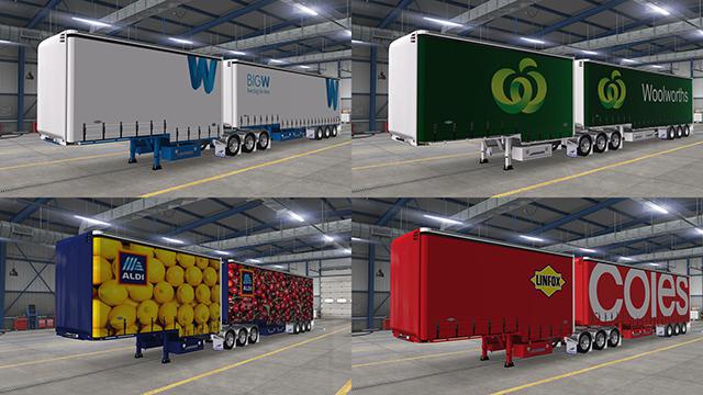 Supermarker skin pack #1 for the C.A.M / TSA dropdeck trailers - Coles - Woolworths - Aldi - Big W **update 10/10** Added B-double skins for all trailers, except Coles, made it linfox as Coles one looks silly compressed so small. Chaged Big W Chasis to Blue Credits: Prim744 |