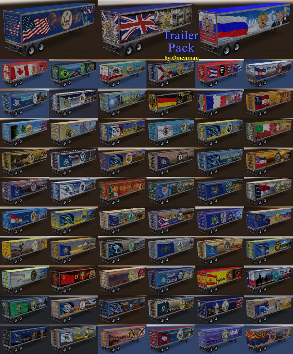 Big pack SCS trailers with skins from Omenman. The package 70 cargo and 300 skins on 4 default trailers (Box, Reefer, Gas and Acid). United 10 mods and 1 trailer: – Trailer Pack Cars 1.0 (50 trailers) – Trailer Pack Clothing 1.0 (19 trailers) – Trailer Pack Drinks 1.0 (26 trailers) – Trailer Pack Electronics 2.0 (50 trailers) – Trailer Pack Foods 1.0 (12 trailers) – Trailer Pack Fuel 2.0 (12 trailers) – Trailer Pack Games 1.0 (5 trailers) – Trailer Pack Geographic 1.0 (63 trailers) – Trailer Pack Logistic Company 3.0 (32 trailers) – Trailer Pack Stars 3.0 (30 trailers) – And trailers “Omenman” Changes in version: 1. Added 2 new cargoes 2. Added 10 new skins from mods “Trailer Pack States 6.0” (Mods “Trailer Pack States 6.0” and “Trailer Pack Cities and Countries 3.0” combined in mod “Trailer Pack Geographic 1.0”): – Alabama – Georgia – Mississippi – Missouri – North Carolina – Ohio – Pennsylvania – South Carolina – Tennessee – Virginia All trailers are autonomous and included in the traffic. If you find any missed errors, report it! For version 1.30 Credits: SCS, Omenman Credits: SCS, Omenman |