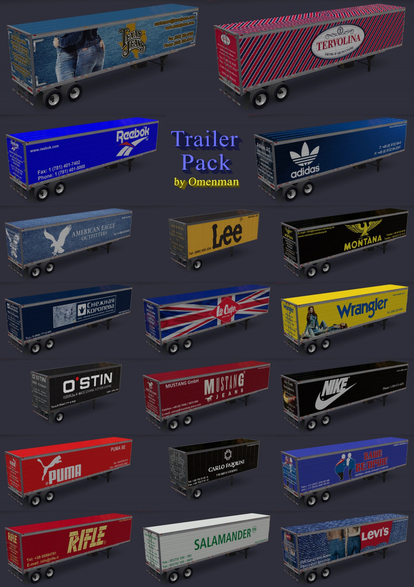 Mod of trailers with skins of brands clothes and footwear. In the package 8 cargo and 19 skins on 2 trailers (Box and Reefer): – Adidas – American Eagle – Carlo Pazolini – Lee – Lee Cooper – Levis – Montana – Mustang – Nike – O’Stin – Puma – Reebok – Rifle – Salamander – Tervolina – Texas – Wrangler – Vashe Velichie – Snezhnaya koroleva Changes in version: 1. Almost all the skins of trailers have been changed. 2. Trailers are synchronized with the same-name mod for ETS-2. 3. In the future all mods for ETS-2 and ATS will be updated in parallel. For version 1.30 Credits: SCS, Omenman Credits: SCS, Omenman |