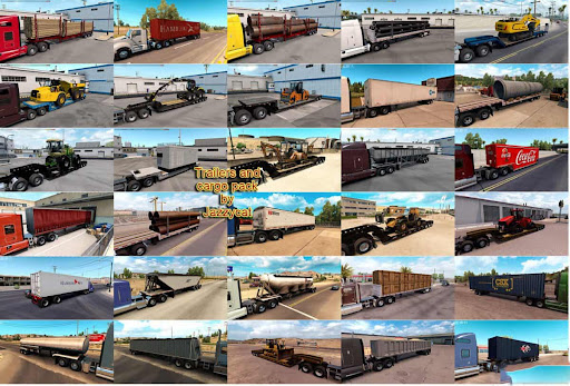 Pack adds in game 44 new trailers and 140 new cargo. All standalone. Works on any maps. For ATS version 1.41.x Compatible with all my packs. Models and skins by SCS Software, Giant Software, SoftLab, Astragon Software, Polygonish, Cape, Bruno77, Bora, Hardtrucksthebest, Rubberduck, Mavis, Sherry0, Tony1971, luder, bayonet, petercar379, KMN Modding, Smarty, TruckSim, Ivan, Dogebilt, Brown Modding, Technicmods, Jura2470, Dietz Modding, bansheewoj, Bcbuhler, DocElyoc, Jessy, CaMOnLy, Habdorn For english version you must have in mod folder two files: trailers_and_cargo_pack_by_Jazzycat_v4.6_ats_base.scs trailers_and_cargo_pack_by_Jazzycat_v4.6_ats_eng.scs Version 4.6 – added different new cargo for drop deck trailers Credits: JC |