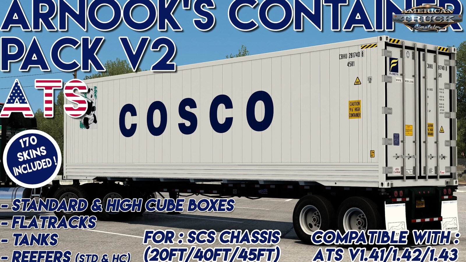 Container Pack - quality pack mods which change default skins by SCS Software with improved correct codes, decals, details and much more. Adds to the game 20, 40 and 45-foot containers with 170 skins of real companies. This mod is converted from ETS2 and adapted to ATS. Features Container Pack: - Available in the freight Market & for owned trailers - The skin-selection is made randomly by the game (same system as SCS's original containers) - All container variants in traffic (except for the 45ft for the moment) - Supports both default & custom dedicated cargos: --> Default cargos : just use the same cargos as you usually do and the default skins will be replaced by mine --> Dedicated cargos :search for "Box Container" OR "Box Container HC" OR "Reefer Container" OR "Reefer Container HC" OR "ISO Tank Container" OR "Flatrack container", depending on the type of container that you want. Changes in v2.0: - Added 20 skins to the new 40ft HC reefer container; - Added new custom cargo: Reefer Container HC; - Added 40ft HC reefer; - Added missing companies to custom loads; - V2 is compatible with ATS V1.41,1.42 & 1.43. Credits: Arnook, JUseeTV, MDModder |