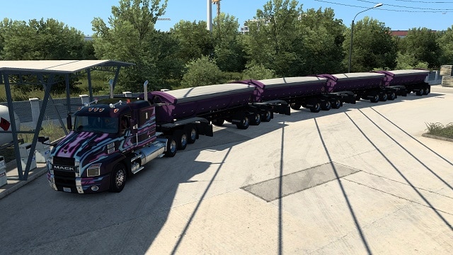 Update v1.1: Added more combinations, unlocked side skirts for box trailers, updated names of trailers in-game, tweaked per-axle weight limits Adds the following B-Train options as ownable trailers: Box/Insulated/Reefer: B-Triple (8 axle): Two 3-axle Bs and one 2-axle 32ft. B-Triple (8 axle): Two 3-axle Bs and one 2-axle 45ft. B-Triple (9 axle): Two 3-axle Bs and one 3-axle 53ft.* B-Quad (11 axle): Three 3-axle Bs and one 2-axle 32ft.* Flatbed/Tarp: B-Triple (8 axle): Two 3-axle Bs and one 2-axle 32ft. B-Triple (9 axle): Two 3-axle Bs and one 3-axle 45ft. B-Triple (10 axle): Two 3-axle Bs and one 4-axle 53ft.* B-Quad (11 axle): Three 3-axle Bs and one 2-axle 32ft.* Dumper: B-Triple (9 axle): Two 3-axle Bs and one 3-axle 36ft. B-Quad (11 axle): Three 3-axle Bs and one 2-axle 30ft. B-Quad (12 axle): Three 3-axle Bs and one 3-axle 36ft.* *High chance of clipping issues when taking them out of the garage or when being towed to a service station, use caution. These trailers have exclamation points (!!!) on the end of their name to identify them. All combinations are listed under B-Double chain type for their respective trailers. They use the stock trailer models so they're compatible with rim/tire/paintjob/etc DLCs. I've also unlocked side skirts for the box trailers. Additionally, to make using these trailers worthwhile, I've changed every state to have a maximum vehicle weight of 100 tons. There's still per-axle weight limits though. Not sure if any of my trailers have enough axles to hit 100 tons, or if there's any cargo that heavy, but either way it allows you to carry very heavy loads. There's also no state length restrictions on these, you can use them anywhere (anywhere they will fit, that is). Maybe that's unrealistic, but then I'm pretty sure no states allow B-Quads anyways. Just pretend that you've got an oversize load permit for every job. Credits: purpleicecream |
