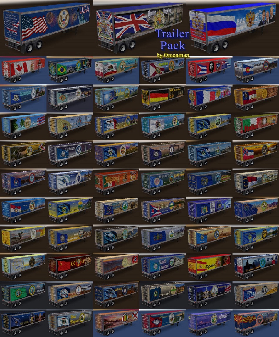 Mod of trailers with skins of geographical objects. In a package 35 cargo and 63 skins on reefer trailer: – Alabama – Alaska – Arizona – Arkansas – Brasil – California – Canada – Colorado – Connecticut – Cuba – Delaware – Florida – France – Georgia – Germany – Hawaii – Idaho – Illinois – Indiana – Iowa – Italia – Kansas – Kentucky – Louisiana – Maine – Maryland – Massachusetts – Mexico – Michigan – Minnesota – Mississippi – Missouri – Montana – Nebraska – Nevada – New Hampshire – New Jersey – New Mexico – New York – North Carolina – North Dakota – Ohio – Oklahoma – Oregon – Pennsylvania – Rhode Island – South Carolina – South Dakota – Spain – Tennessee – Texas – United Kingdom – United States – Utah – Vermont – Virginia – Washington – Washington, D.C – West Virginia – Wisconsin – Wyoming – Russia – USSR Changes in version: 1. United 2 mods: – Trailer Pack Сities and Countries 3.0 (12 trailers) – Trailer Pack States 6.0 (51 trailers) All trailers are autonomous and included in the traffic. For version 1.30 Credits: SCS, Omenman Credits: SCS, Omenman |