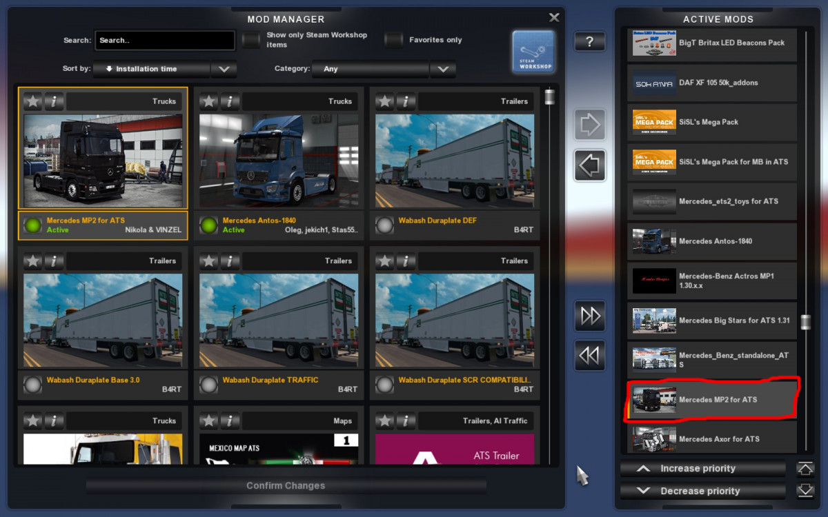 Mercedes MP2 update for ATS 1.31.x NOT standalone Working only along with Mercedes Trucks Megapack for ATS 1.31. Updates: – Fixed interior. – Fixed licence plate to ATS regular. – Have less size. IMPORTANT NOTE! This mod now MUST BE BELOW Mercedes Benz standalone ATS .scs(Mercedes truck megapack’s main mod) in mod manager, OTHERWISE entering dealer game will CTD! LOOK AT NEW LOAD ORDER PICTURE. Don’t forget to sell old MP2 truck before you enable and buy this new one in the game. Old MP2 mod you can delete then. Mercedes trucks Megapack you can grab here Credits: Nikola & VINZEL, ATS update – vasja555 Credits: Nikola & VINZEL, ATS update – vasja |