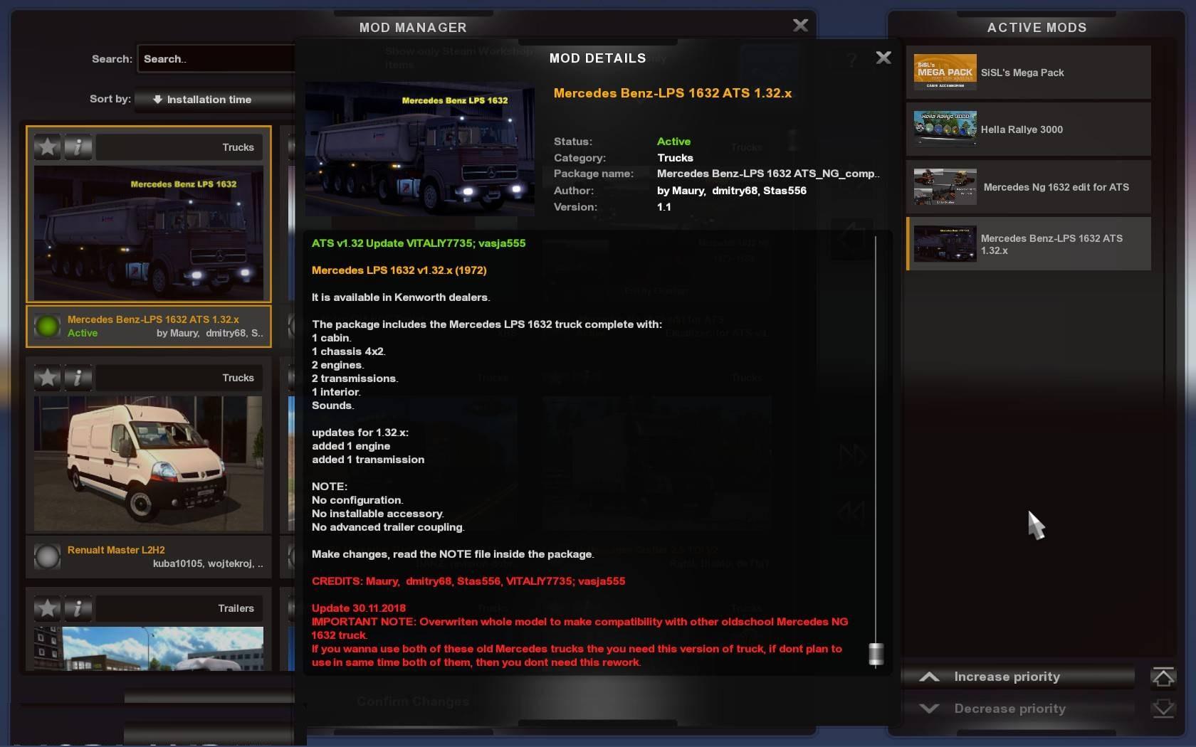 Update 30.11.2018 (v1.1) IMPORTANT NOTE: Overwriten whole model to make compatibility with oldschool Mercedes NG 1632 truck for ATS. If you wanna use both of these old Mercedes trucks in the same time the you need to use this update of this truck, if dont plan to use in same time both of them, then you dont need this rework. These both truck had the same truck name in the mod and that caused conflict with parts that they used together. Nothing else has changed. dmitry68, Stas556, VITALIY7735, Maury; patched by vasja555 Credits: dmitry68, Stas556, VITALIY7735, Mau |