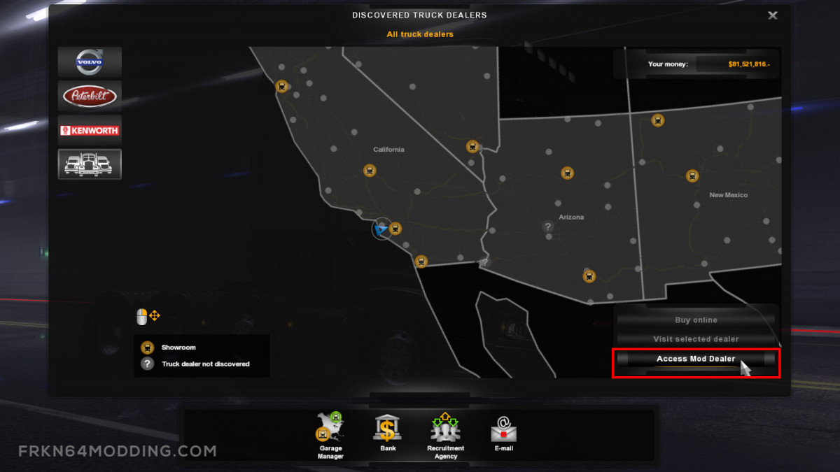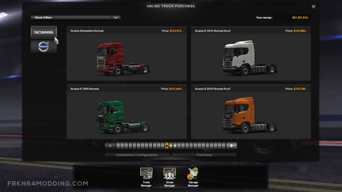FEATURES Available trucks in the mod: Scania R 2009 – Scania Streamline – Scania R 2016 – Scania S 2016 – All trucks completely converted from ETS 2 without any bugs. – Supports Advanced Trailer Coupling feature. – Supports Trailer Cables feature. – Supports Mod Dealer. (See the screenshots to learn how to buy a Scania using the Mod Dealer.) Warning This mod was tested many times and no issues found. If you get an error while using this mod, you should know that it is not caused by this mod, but from other mods you use. You can try again by disabling all other mods UPDATE NOTES – Added support for 1.35 update. – Removed Scania Truck Dealer. – Added Mod Dealer support. – Removed Scania trucks from AI traffic. – Minor bug fixes REQUIRED GAME VERSION v1.35.X Credits: Frkn64 |