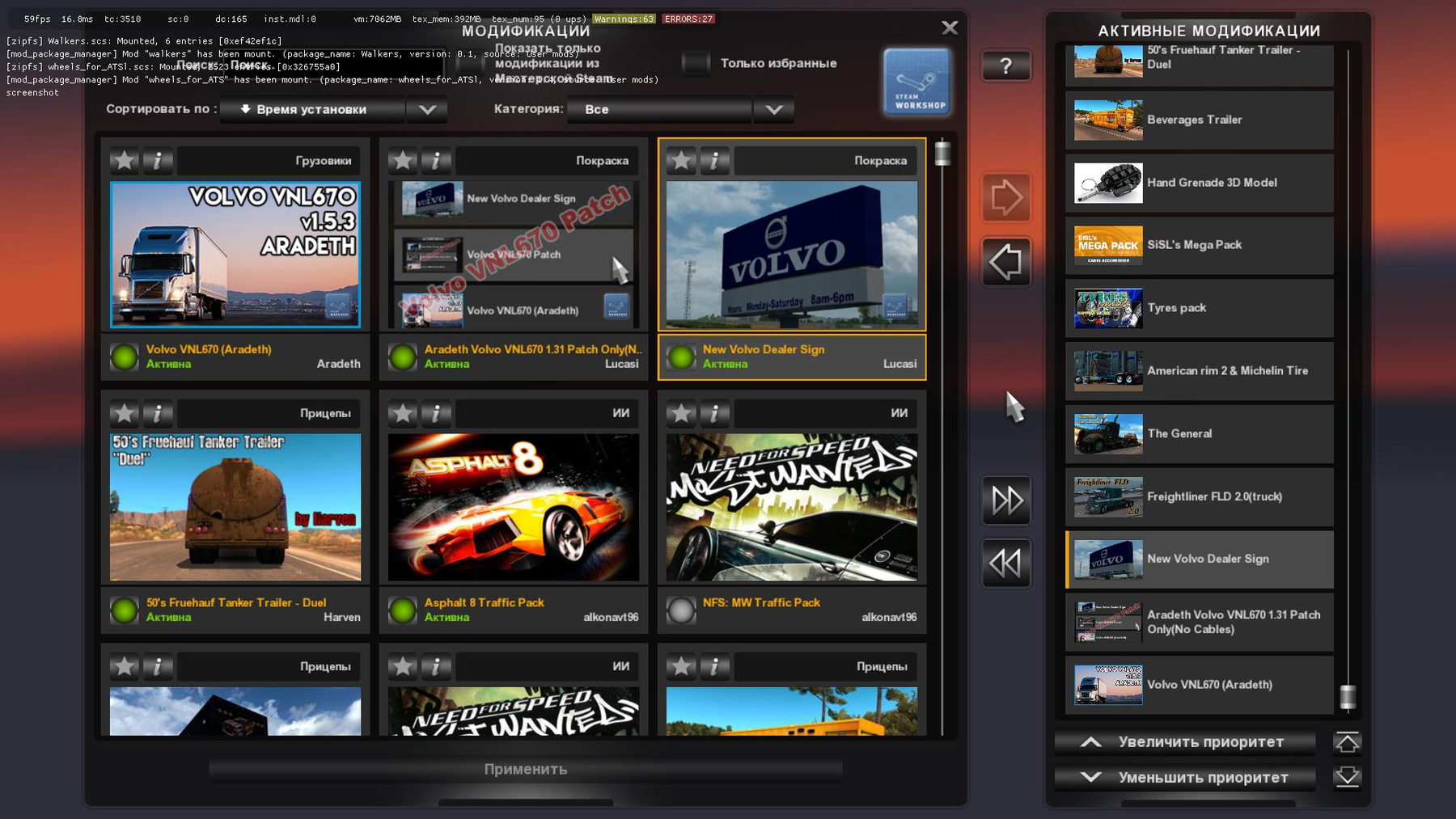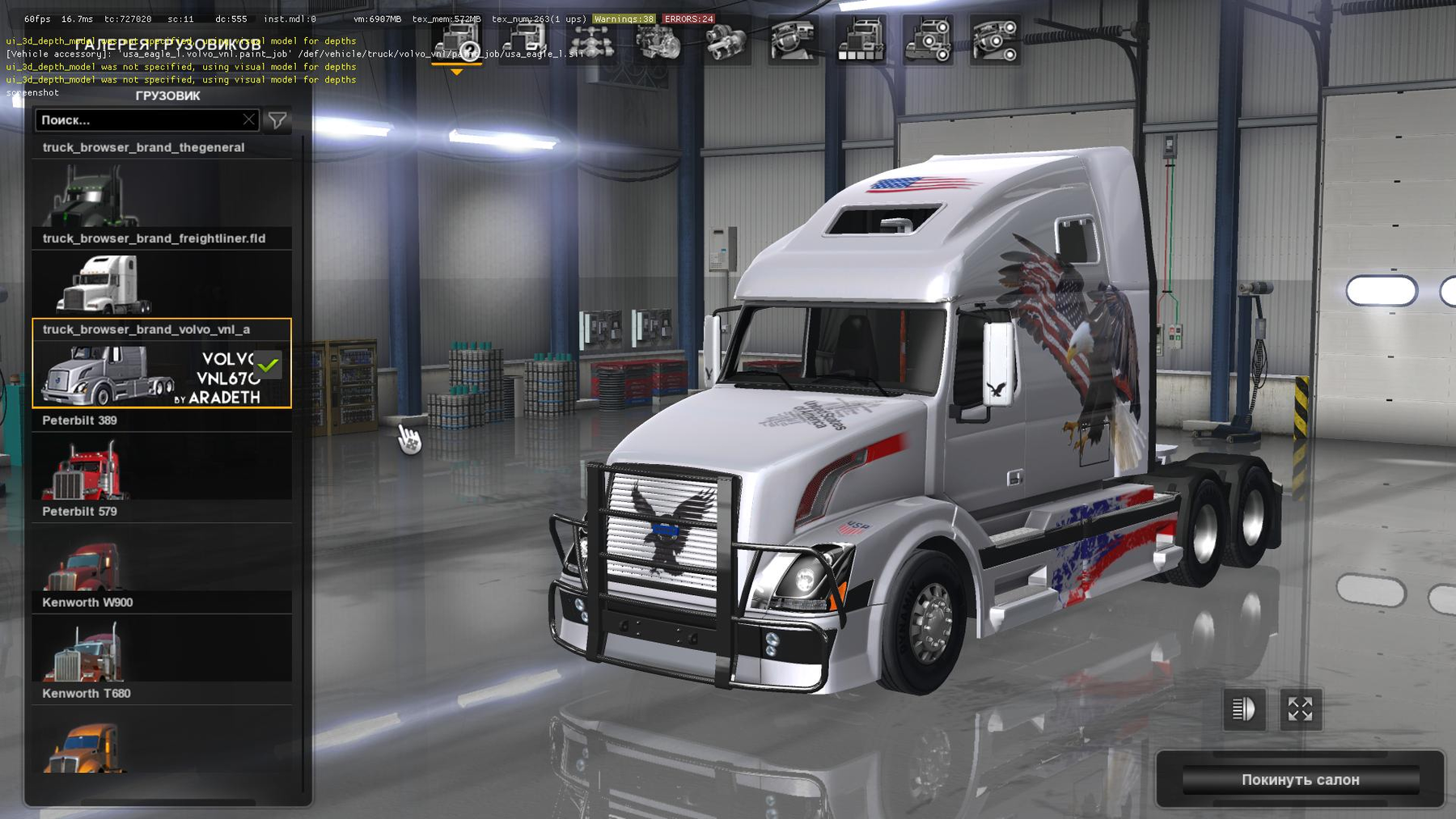 * You can find the truck in VOLVO Dealer. (San Francisco, Las Vegas and Tucson. You need to discover the dealers first.) Main features; - 12 different chassis. - Volvo, Cat, ISX, Cummins, Paccar engines with own sounds. - I-Shift, Eaton Fuller, Allison transmissions. - 5 different interiors with 900 and 1800 degree steering wheel support. - Full animation support.(Wheel, gps, transmission, pedals, indicators, sticks, tv etc.) - Standalone and available in quick jobs. - Compatible with all DLCs. - Both exterior and interior model have almost the same amount of polygon count as vanilla trucks that means in-game fps will not drop while driving this truck. - A wide variety of exterior/interior customization options. (Overall 300+ different options on 60+ different parts of the truck, plus lots of accessories.) CHANGELOG (20.06.18) Update for 1.31 Works only on ATS 1.31.x Credits: Aradeth, Kriechbaum, Piva, ohaha |